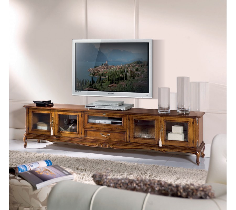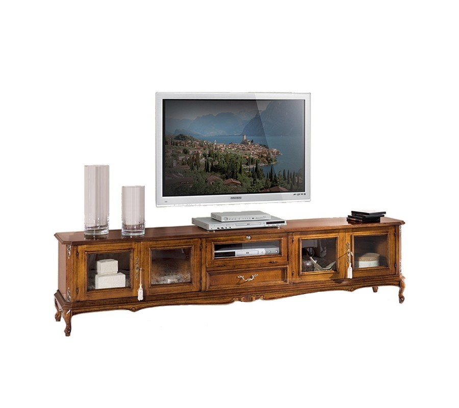 Exkluzívny TV stolík z našej kolekcie talianskeho nábytku Emociones, nesúcej typické znaky barokového, klasického i rustikálneho štýlu, vás jednoznačne zaujme nielen svojim unikátnym dizajnom ale aj množstvom úložného priestoru, ktorý ponúka. TV stolík je vyrobený z kvalitného ručne opracovaného masívneho dreva, ktorého vyrezávané zdobenie je vkusne doplnené tvarovanými chippendale nožičkami a kovovými prvkami v podobe úchytiek dvierok a zásuvky. TV stolík Emociones ukrýva dostatok úložného priestoru v podobe dvoch dvojdverových skriniek s presklenými dvierkami po stranách, praktickej zásuvky uprostred s ozdobným čelom a malej odklápacej skrinky nad zásuvkou so sklenenými dvierkami. TV stolík Emociones odporúčame najmä milovníkom hradov a zámkov, keďže vďaka svojmu starožitnému vzhľadu razom premení vašu obývaciu izbu na zámockú komnatu.