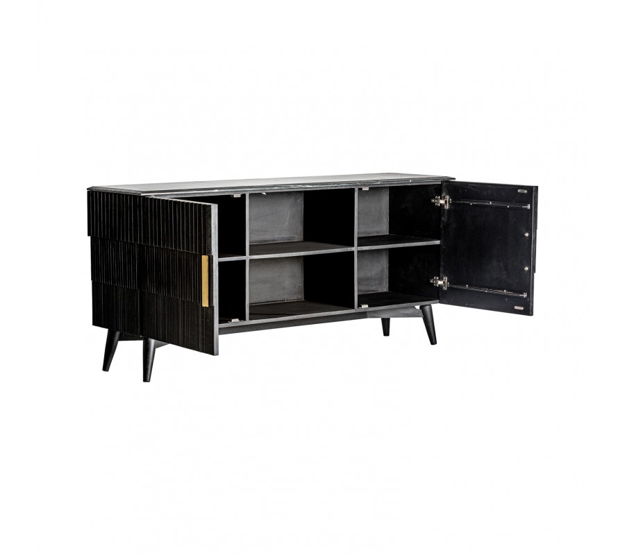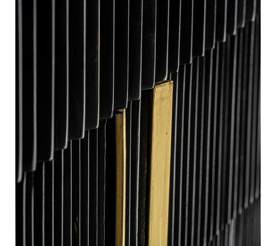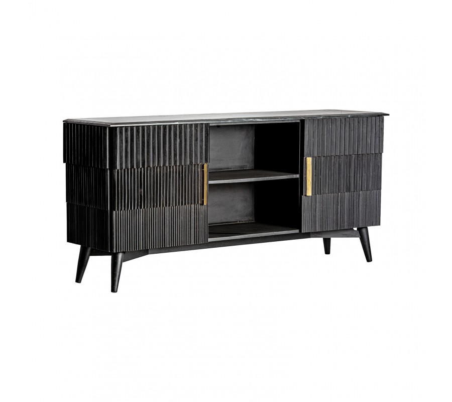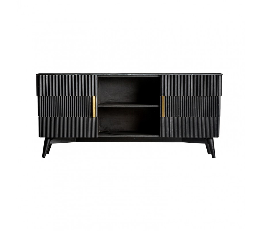 Art-deco mramorový TV stolík Plissé Nero z masívneho dreva v čiernom prevedení s dvierkami so zlatými kovovými rukoväťami 175cm