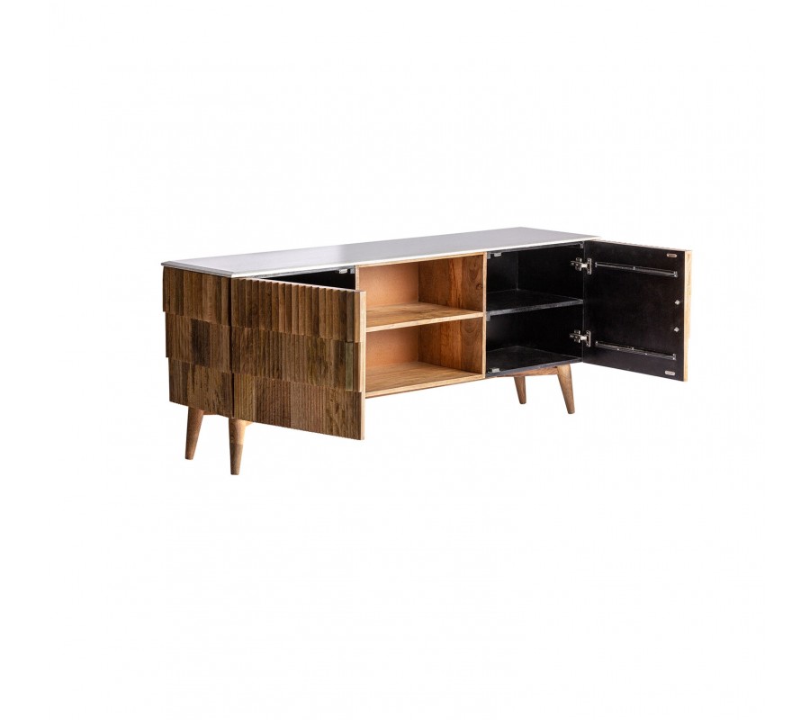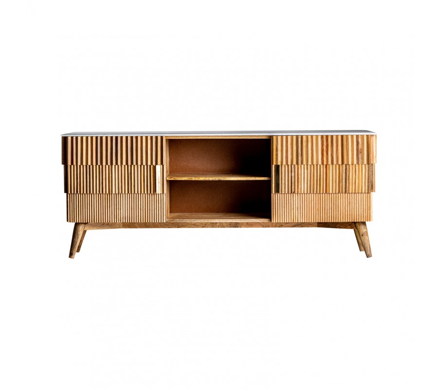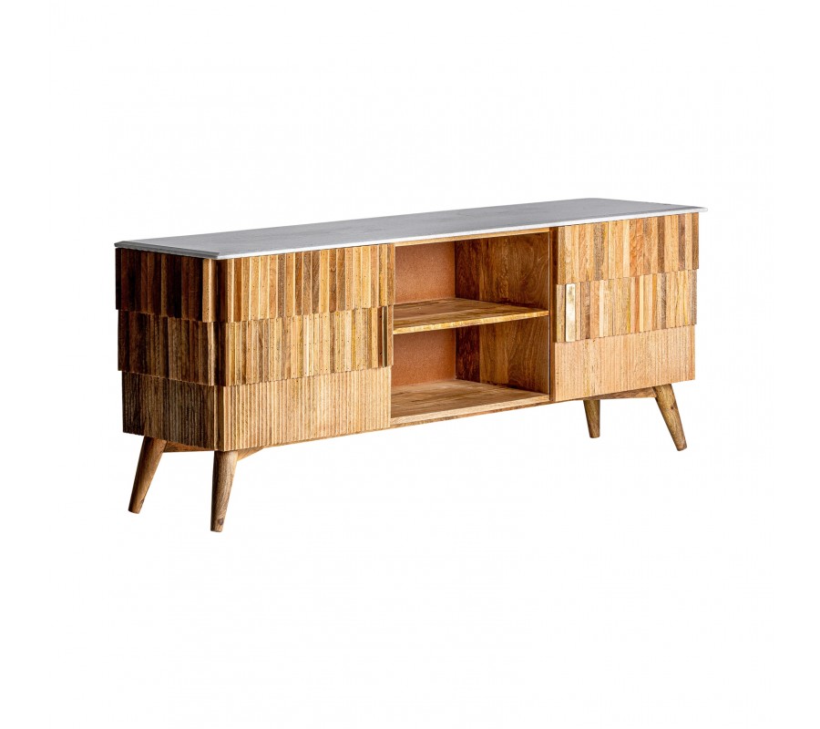 Exkluzívny TV stolík Plissé Nature s mramorovou doskou a prírodným hnedým masívnym drevom s dvierkami a zlatými rukoväťami 175cm