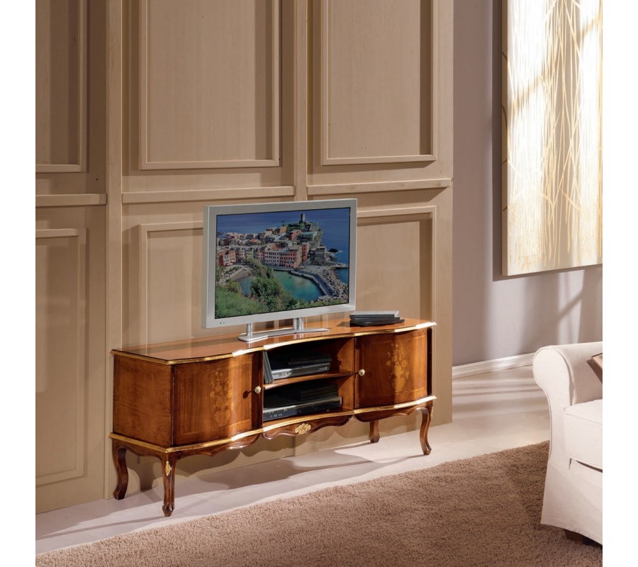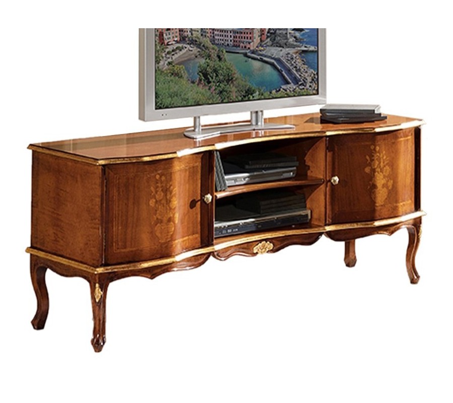 Jedinečný TV stolík z kolekcie masívneho talianskeho nábytku Clásica je kúskom, ktorý vás prenesie do luxusných historických barokových víl. Je vyrobený z kvalitného masívneho dreva s elegantnou hnedou povrchovou úpravou, ktorá je obohatená o krásnu ornamentálnu intarziu v podobe kvetov. Okrem jedinečného dizajnu je taktiež aj praktickým kúskom vďaka ponúkanému úložnému priestoru v podobe dvoch otvorených poličiek a poličiek s dvomi dvierkami po boku. Stolík zdobí precízne ručné vyrezávanie na hranách a nožičkách, ktoré mu dodáva nezameniteľný rustikálny nádych. TV stolík Clásica zapadne najmä do rustikálne, koloniálne či barokovo ladených obývačiek v kombinácii s ďalším masívnym nábytkom. Odporúčame taktiež kombináciu s čalúnenou zamatovou sedačkou či kreslo s bohatými dekoratívnymi prvkami.