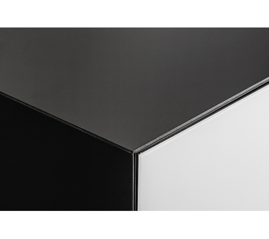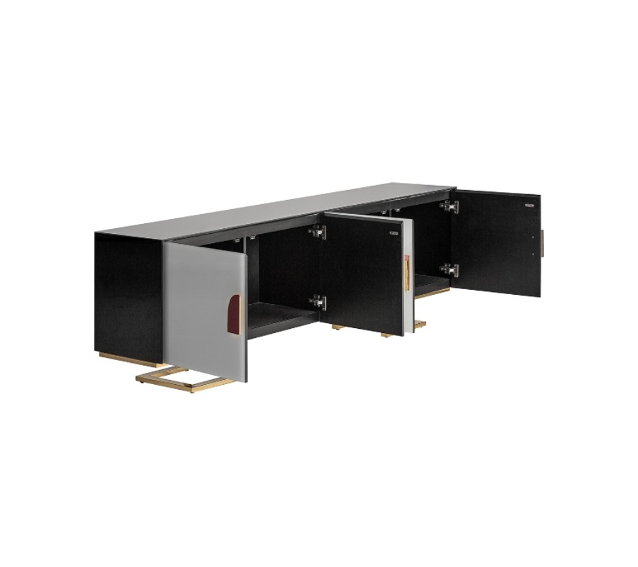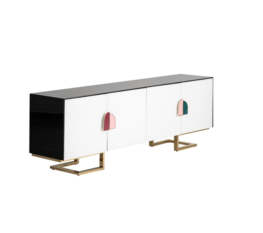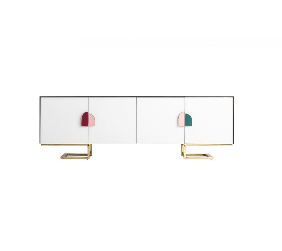 Luxusný art-deco TV stolík Bluejay zo skla a kovu v bielej farbe s dvierkami s farebnými rukoväťami 200cm