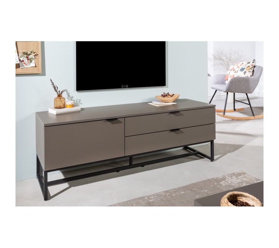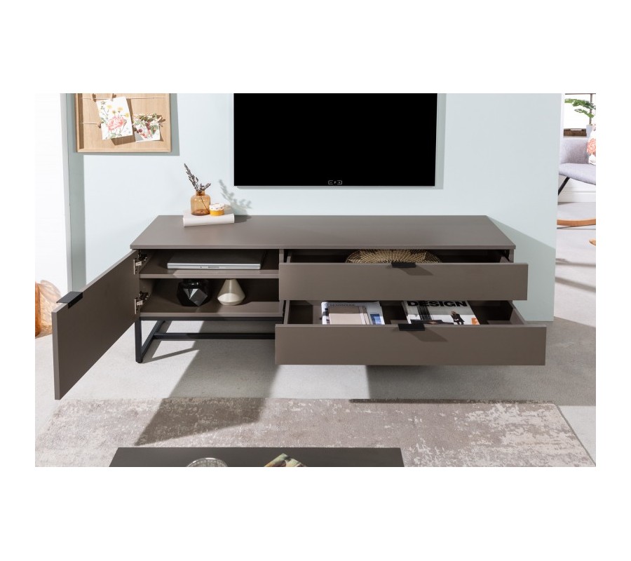 Elegantný moderný obdĺžnikový TV stolík Marsh v matne sivej farbe s úložným priestorom a čiernou kovovou podstavou 140cm