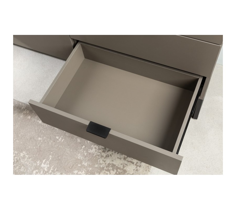 Dizajnový TV stolík Marsh v obdĺžnikovom tvare je ideálny kúsok, ktorý doplní moderný vzhľad do vašej obývačky. Tento jedinečný kúsok sa nesie v modernom tmavosivom matnom vyhotovení, ktoré je doplnené čiernou konštrukciou z kovu, vďaka čomu stolík naberá chladný kovový design. Tento kúsok disponuje aj bohatým úložným priestorom v podobe dvoch rozmerných zásuvok a jednej bočnej priehradky s poličkou a modernými dvierkami. Úložný priestor je detailne doplnený čiernymi kovovými rukoväťami. Matné tmavo sivé prevedenie mdoerného TV stolíka Marsh vynikajúco vynikne s výraznými farbami nábytku a sedačky napríkald s bielou, červenou alebo žltou, a taktiež k tomuto kúsku odporúčame kombinovať aj živú zeleň.