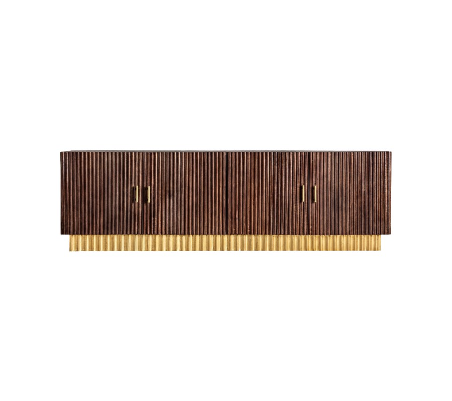 Vkusný a dizajnový štvordverový TV stolík z rady Lalique je vyrobený z kvalitného mangového masívu a disponuje vkusným vertikálnymi kanelúrami, ktorých vznik datujeme až do čias antického Grécka, kde môžeme tento reliéf vidieť napríklad na dórskych stĺpoch prítomných i v rímskom Koloseu. Na oboch dvojkrídlových dverách TV stolík Lalique disponuje dvoma vertikálnymi rukoväťami valcovitého tvaru zlatej farby. V dolnej časti je TV stolík Lalique dizajnovo obohatený o úzku podstavu zlatej farby. Vnútro TV stolíka Vám ponúka úložný priestor. Luxusný TV stolík Lalique v art-deco štýle dokonale vinikne vo vkusne zariadených glamour či art-deco priestoroch v kombinácii so živou zeleňou či v extravagantných spálňach alebo hotelových či hosťovských izbách v kombinácii s výraznými farbami a zlatými doplnkami.