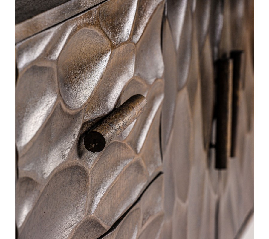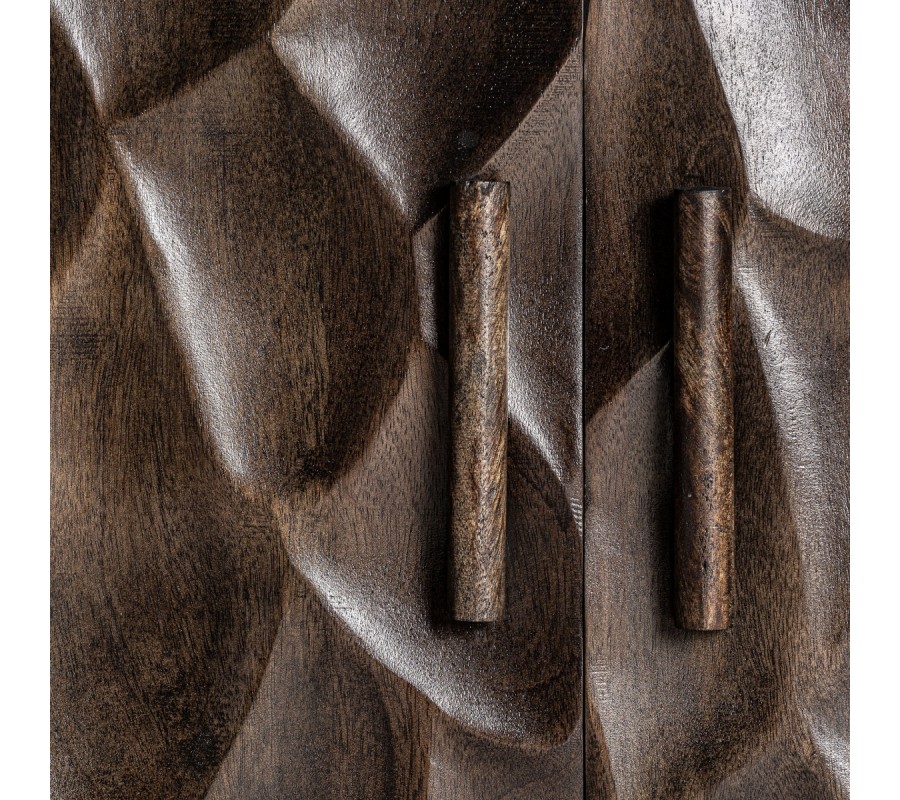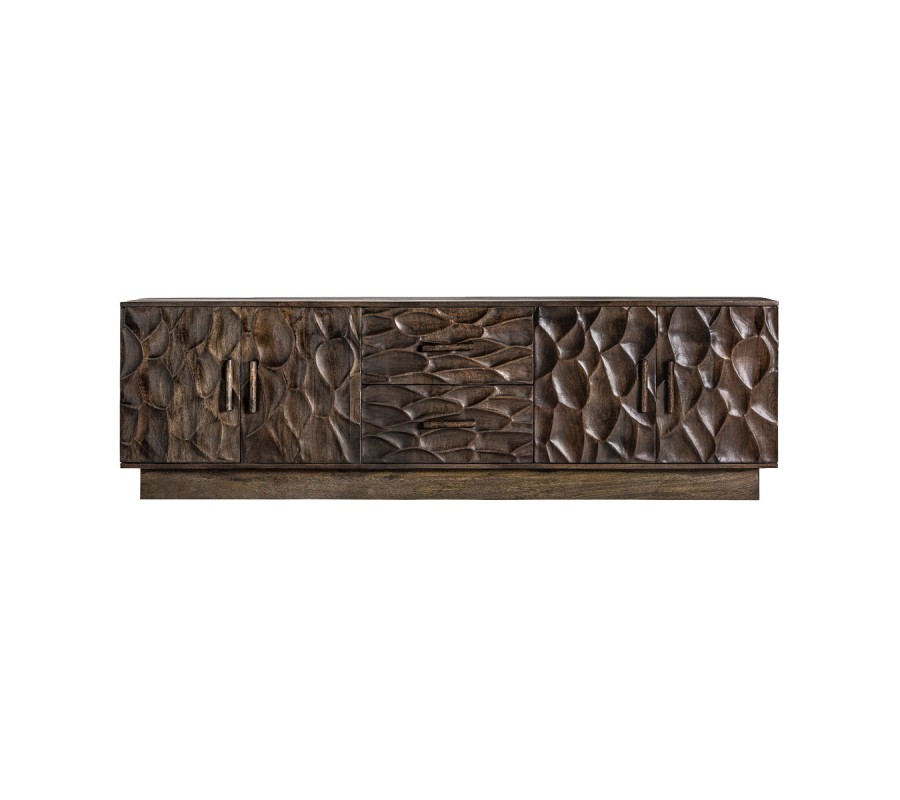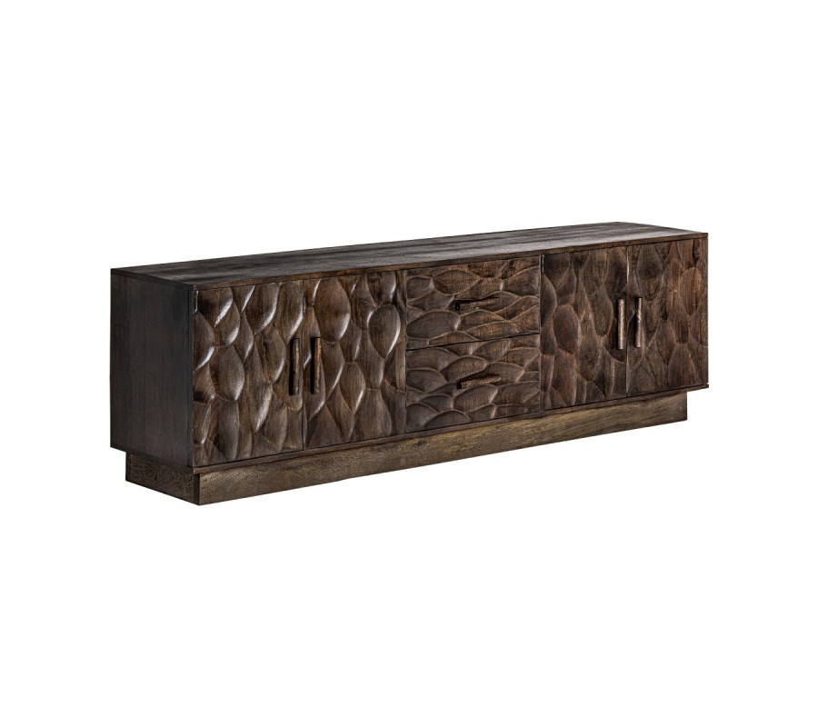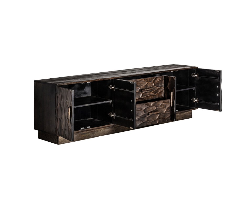 Jedinečný a dizajnový televízny stolík z rady Lalique je vyrobený z kvalitného mangového masívu vkusnej karobovej farby, ktorý disponuje povrchovou úpravou v podobe jemného reliéfu pripomínajúceho zvrásnenú krajinu. TV stolík Lalique poskytuje veľké množstvo úložného priestoru v podobe štvordverovej skrinky, ktorá ukrýva priestranné police a rovnako tak i v podobe zásuviek. Skrinky i zásuvky sú obohatené o masívne horizontálne i vertikálne rukoväte valcovitého tvaru. Televízna skrinka je zasadená na zúženej masívnej drevenej podstave, ktorá ju opticky nadnáša a v priestore tak je jprítomnosť odľahčuje. Tv stolík Lalique odporúčame v rámci moderných art-deco obývačiek či spoločenských miestností a lobby barov kombinovať s dekoráciami výrazných farieb či z kovu zlatej farby.