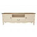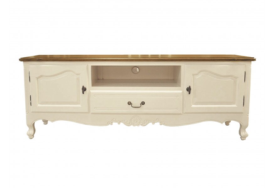 Masívny provensálsky TV stolík Preciosa v obdĺžnikovom bielom vyhotovení s dekoratívnymi nožičkami a úložným priestorom 170cm