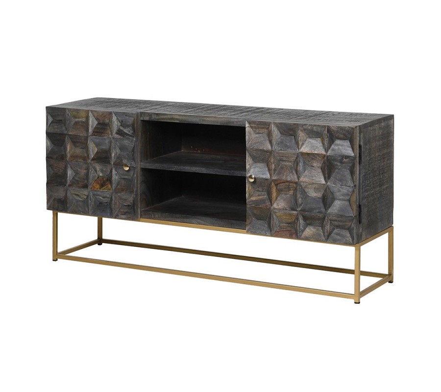 Kolekcia art-deco štýlového nábytku Relia Vám prináša krásny dizajnový kúsok do Vašej luxusnej obývačky, ktorý výborne vynikne v tmavo zariadených interiéroch v kombinácií so zlatou farbou. Mohutný art-deco TV stolík disponuje jedonoduchými a priamymi líniami s ostrými hranami, ktoré sú doplnené štvorcovým vyrezávaním. Mohutné prevedenie TV stolíka Relia je dosiahnuté vďaka kvalitnému masívu z mangového dreva, ktoré disponuje úpravou s vyšúchaným povrchom. Spomenuté vyrezávanie dvierok je v štvorcovom vzore, podobom diamantovému štýlu výrezu, ktoré Vám vytvorí zaujímavé tiene počas dňa. Art-deco TV stolík Relia v neposlednom rade disponuje otvoreným priestorom s poličkou a tenkou kovovou podstavou, ktorá dizajnovo doplní tmavé mohutné prevedenie stolíka, a taktiež ponúkne maximálnu stabilitu a pevnosť. Pre doplnenie štýlového prevedenia TV stolíka Relia odporúčame kombináciu s nábytkom z kolekcie Relia.