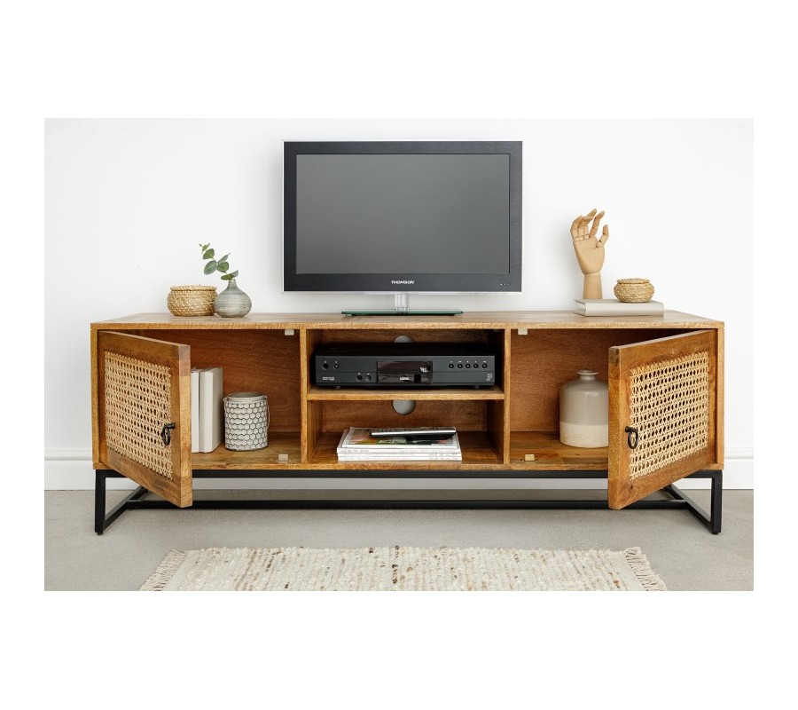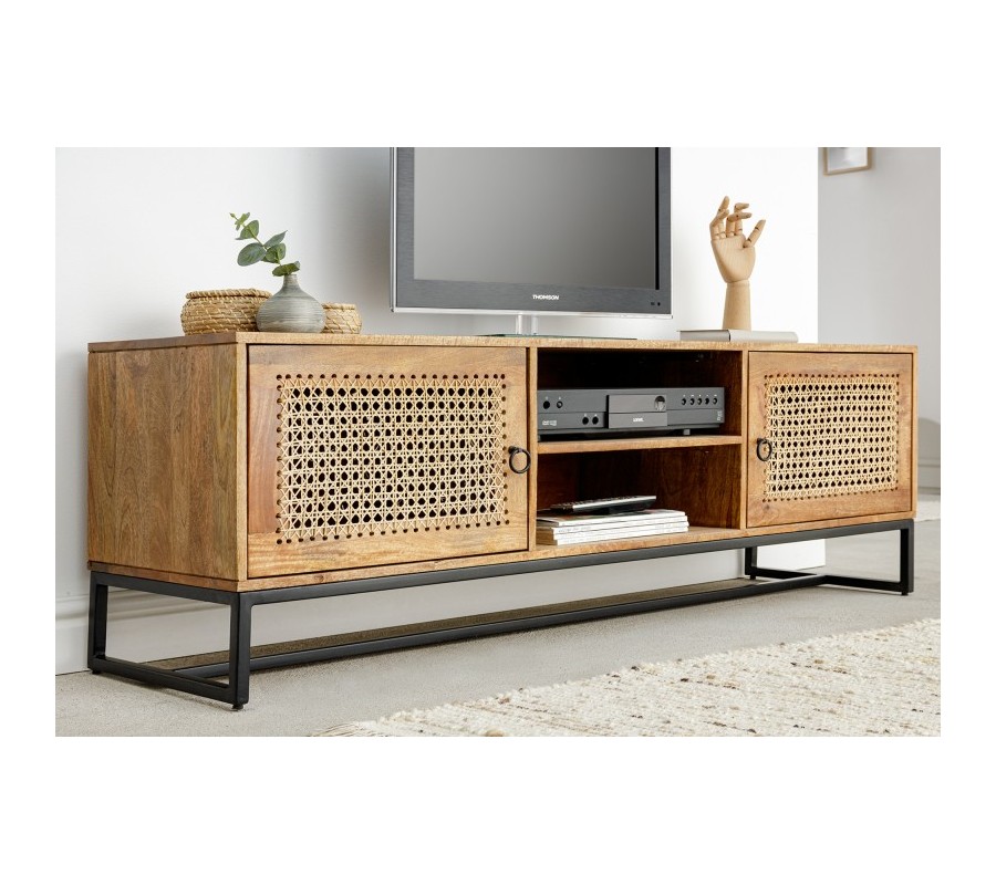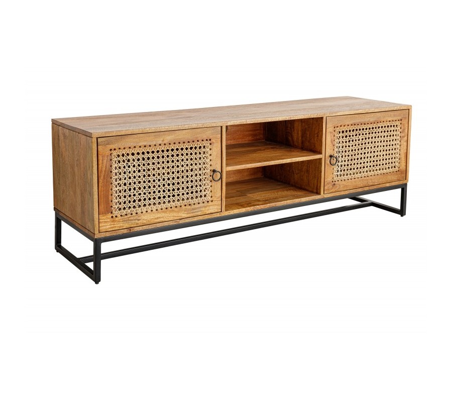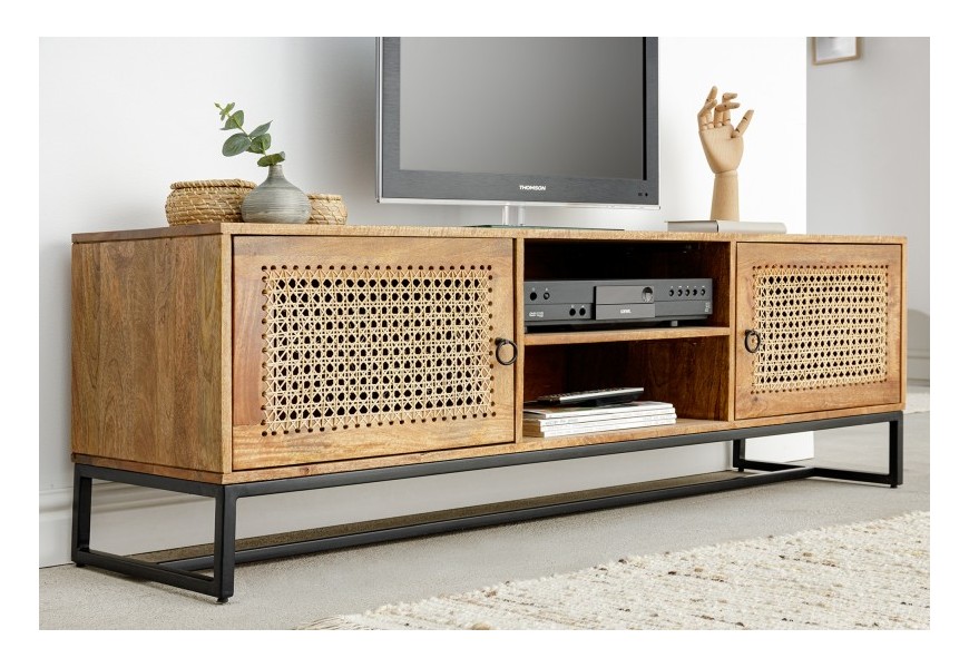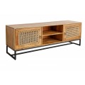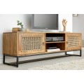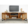Štýlový industriálny TV stolík Selina z mangového masívu svetlohnedej farby s viedenským ratanovým výpletom 150cm