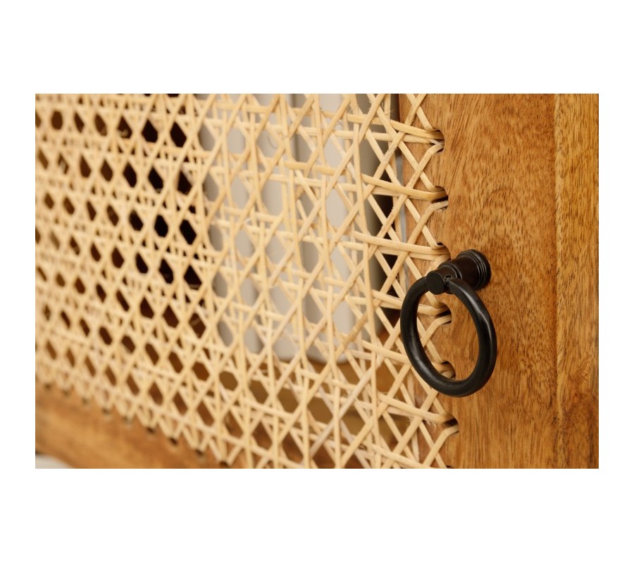 Exkluzívny TV stolík Selina poteší milovníkov elegancie, nadčasového dizajnu a kvalitného spracovania. Pozostáva z masívnej konštrukcie z mangového dreva, ktorá sa nesie v prírodnej svetlohnedej farbe. Povrchová úprava necháva vyniknúť prirodzenú kresbu dreva, vďaka čomu TV stolík vnesie do vašich pristoroch jemný prírodný nádych. Mangový masív je kombinovaný so štýlovým viedenským ratanovým výpletom zdobiacim dve dvierka po stranách. Ratan dodáva stolíku nádych vidieckeho štýlu, čo ho robí výborným adeptom na doplnenie takto ladených priestorov domov, chatiek či drevených zrubov, avšak je aj skvelým prvkoom na doladenie do moderných priestorov, kde vytvorí štýlový kontrast. Okrem poličiek s dvierkami stolík disponuje dvomi otvorenými poličkami vhodnými na elektroniku či vystavenie kníh alebo časopisov. Kontrastne k masívnemu telu pôsobí industriálne ladená kovová podstava čiernej farby. Detaily v podobe čiernych okrúhlych kovových úchytov na dvierkach umocňujú industriálny nádych a príjemne kontrastujú so svetlohnedým drevom. TV stolík Selina si svoje miesto nájde namä vo vidiecky, industriálne i moderne ladených obývačkách nesúcich sa v prírodných odtieňoch.