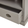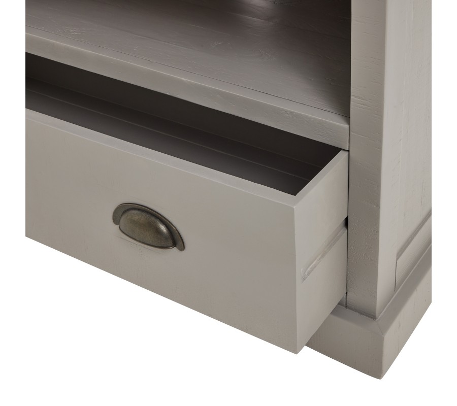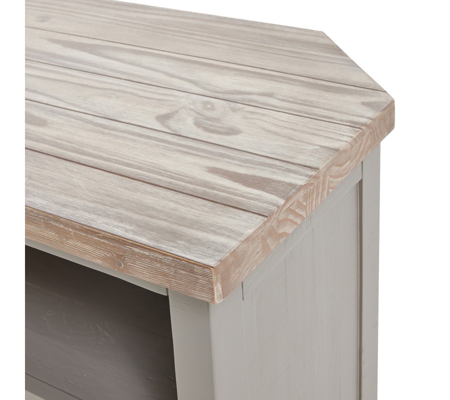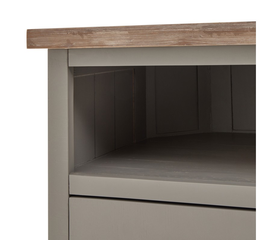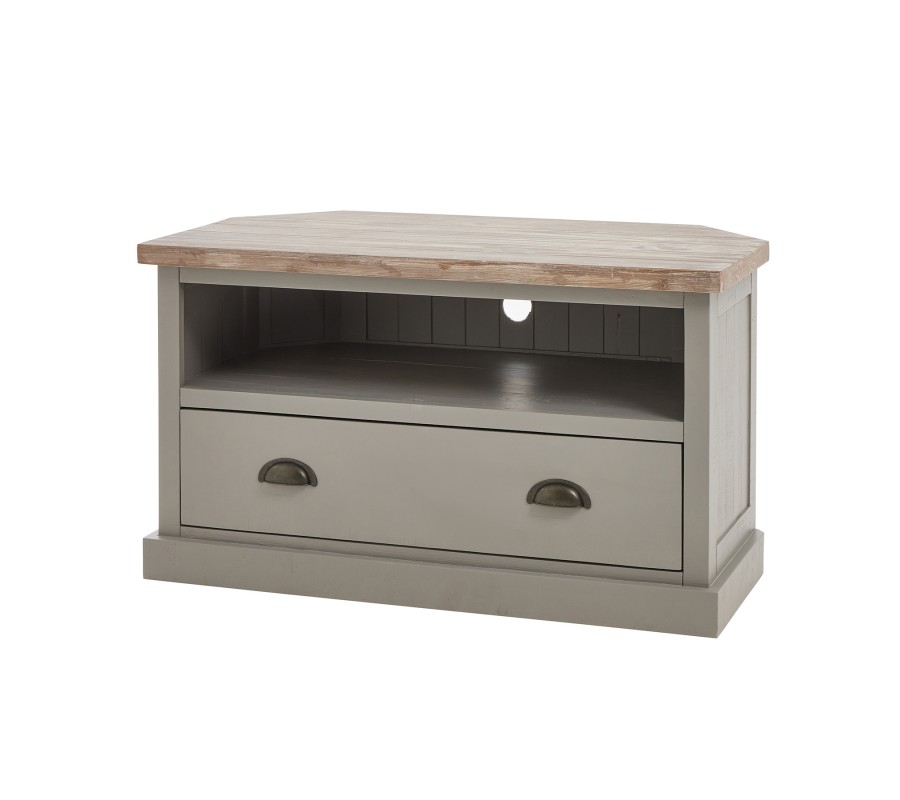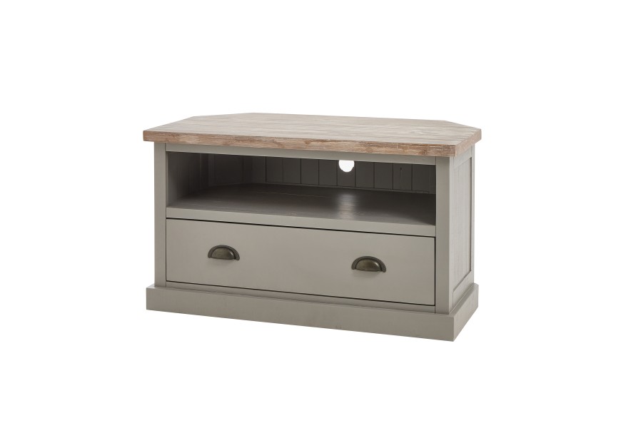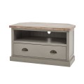 Provensálsky rohový televízny stolík z kolekcie Greytone z masívu v sivom prevedení bez nožičiek so zásuvkou 102cm