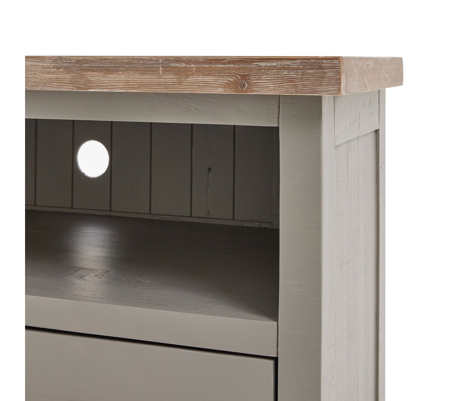Štýlový rohový televízny stolík v masívnom prevedení ohúri svojou originálnou sivou farbou, ktorá dokonale vystihuje nedbalú eleganciu a pôvab provensálskeho štýlu zariadenia. Je skvelým predstaviteľom praktického pomocníka do obývačky. Vďaka jeho zrezaným rohom, kompaktným rozmerom a výrezu určeného na odvádzanie káblov potrebných na zapojenie televízie či satelitných prijímačov naplní očakávania aj toho najnáročnejšieho klienta. Masívne prevedenie vrchnej dosky je vkusne doplnené presvitajúcou prirodzenou kresbou dreva. Drevená konštrukcia televízneho stolíka Greytone je položená na základovej doske bez nožičiek. Stolík disponuje úložným zatvoreným priestorom v podobe zásuvky s dvomi dizajnovými mosadznými úchytmi, nad ktorými je voľný otvorený priestor v podobe poličky. Televízny stolík Greytone sa bude vynímať v obývačkách zariadených v provensálskom či vidieckom štýle a v kombinácii s klasickou bielou či pastelovými farbami vytvorí dokonalú harmóniu. Rozhodne vás oslovia aj ostatné produkty z našej exkluzívnej provensálskej kolekcie Greytone.