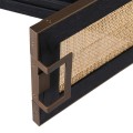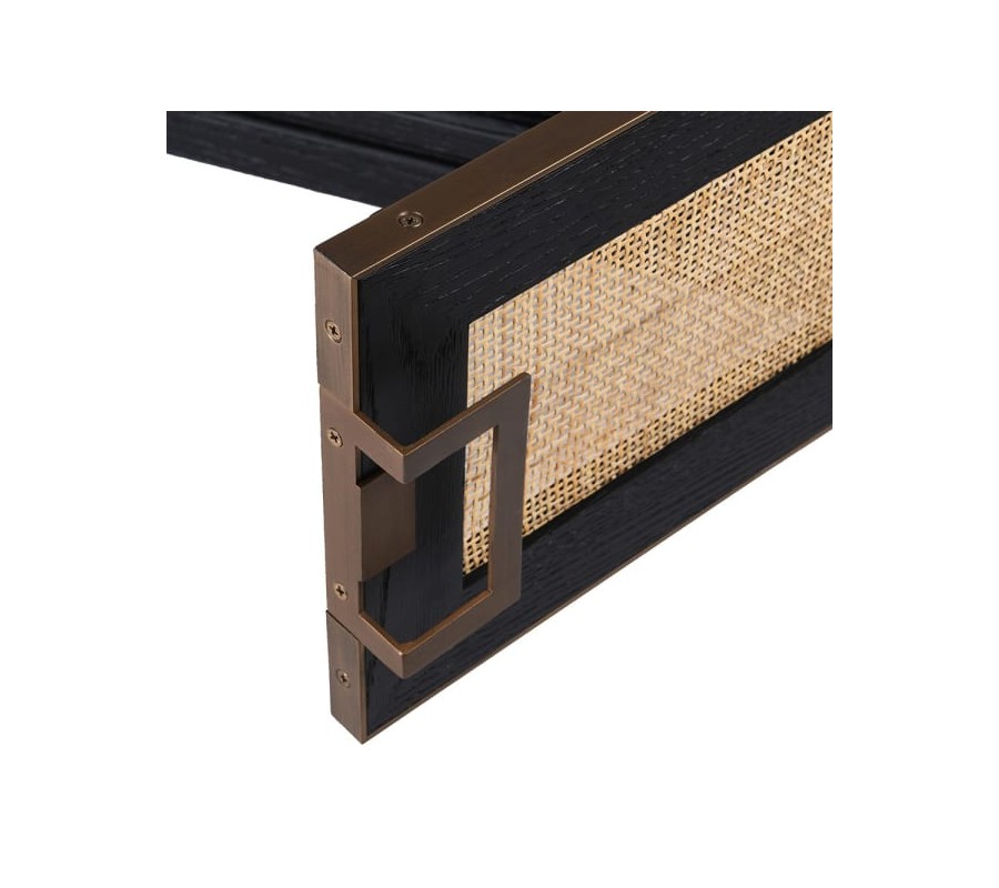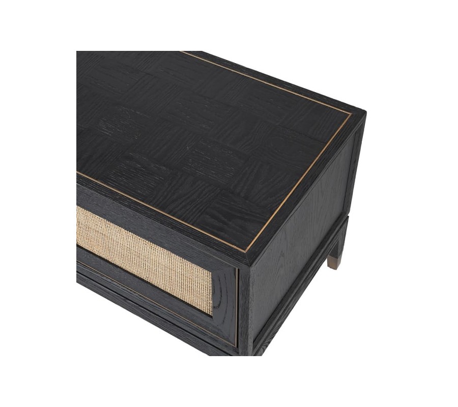 Luxusný TV stolík Emperor je skvelým dominantným kúskom do art deco a moderne ladených obývačiek. Ponúka praktický úložný priestor a nadčasový vzhľad, ktorý si zamilujete najmä vďaka precíznemu spracovaniu a klasickým elegantným tvarom. Stolík Emperor je vyrobený z masívneho dubového dreva s čiernou povrchovou úpravou. Vrchná doska disponuje zaujímavým štvorcovým vzorom dosiahnutým precíznym ukladaním jednotlivých kúskov dreva s rôznymi smermi letokruhov. Stolík disponuje dvomi priestrannými poličkami so štyrmi dvierkami, ktoré sú z prednej strany vyplnené štýlovým ratanovým výpletom svetlohnedej farby. Vzniká tak pútavá farebná aj materiálová kombinácia, ktorá zútulní vaše priestory. Zaujímavým prvkom dodávajúcim stolíku luxusný art deco vzhľad je zlaté zdobenie v podobe lemovania na zásuvkách a dizajnových rukovätí štvorcových tvarov. Zlaté zdobenie sa tiež nachádza na spodnej časti nožičiek. TV stolík Emperor krásne doplní luxusné obývačky a dá sa vhodne kombinova s čalúnenou zamatovou či koženou sedačkou, masívnym konferenčným stolíkom a luxusnými doplnkami v antickej zlatej farbe. Pre zjednotenie priestoru odporúčame tiež ďalšie kúsky z našej kolekcie Emperor!