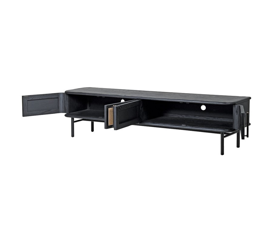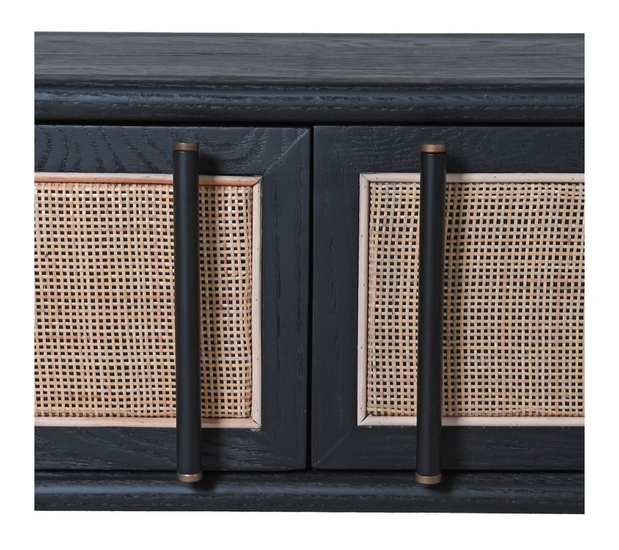 Luxusný čierny TV stolík Emperor z masívneho dreva s poličkami a dvierkami so svetlhnedého ratanového výpletu 200cm