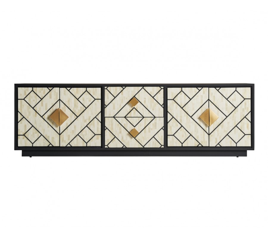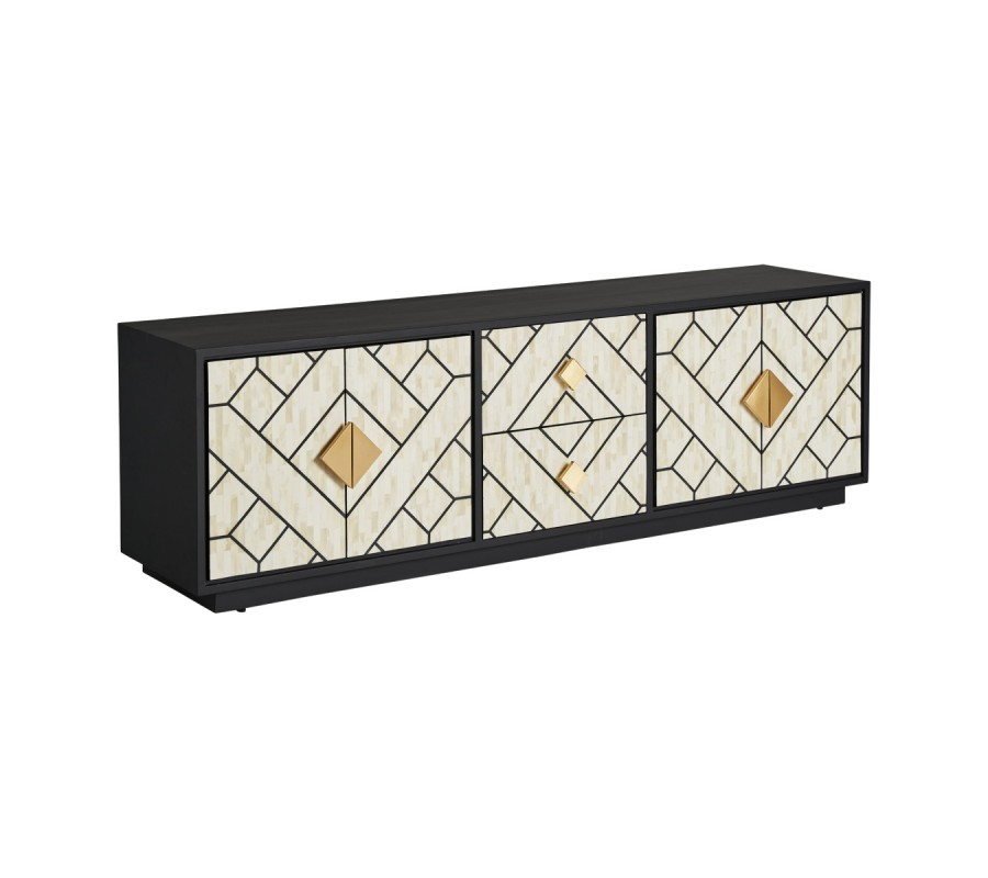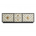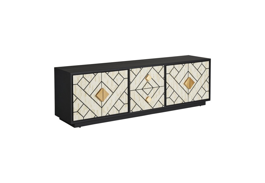 Art deco kovový TV stolík Anisa v čierno-bielom prevedení so zásuvkami a dvierkami so zlatým zdobením 180cm