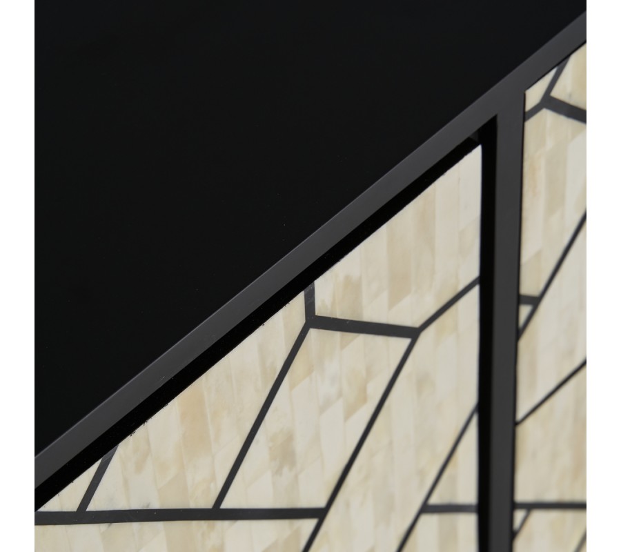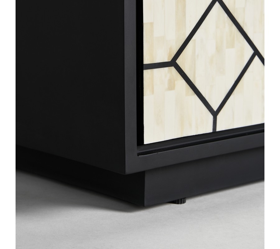 Luxusný TV stolík Anisa predstavuje nádherné, kvalitné a dizajnovo zaujímavé riešenie do art deco ladených obývačiek. Zaujme svojím glamour prevedením pozostávajúcim z čiernej konštrukcie a bieleho zdobenia. Dve praktické zásuvky a poličky so štyrmi dvierkami po bokoch poskytujú dostatok úložného priestoru na elektroniku, knihy či iné predmety. Dvierka aj zásuvky sú z prednej strany zdobené nádhernou intarziou využívajúcou materiál kosti. Jemné farebné a štrukturálne odchýlky jednotlivých kúskov ukladaním vedľa seba vytvárajú zaujímavý parketový vzor. Celú prednu časť stolíka tiež dopĺňa jednoduché čiernej lineárne zdobenie a žiarivé zlaté kosoštvorcové úchyty z kovu. TV stolík Anisa vďaka svojmu unikátnemu honosnému vzhľadu vkusne doplní luxusné art deco a moderne ladené obývačky. Pre zjednotenie priestoru odporúčame aj ďalšie kúsky z rady Anisa, zamatovú čalúnenú sedačku či kreslá a doplnky zlatej farby.