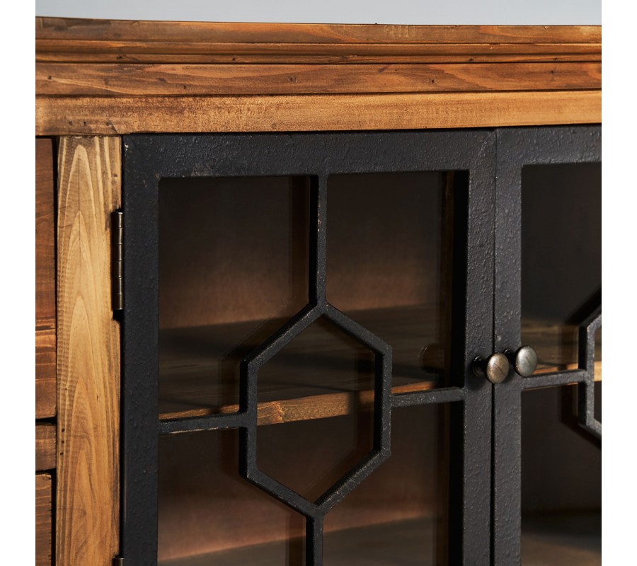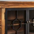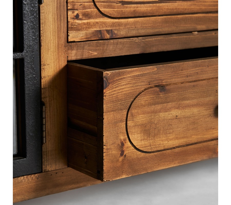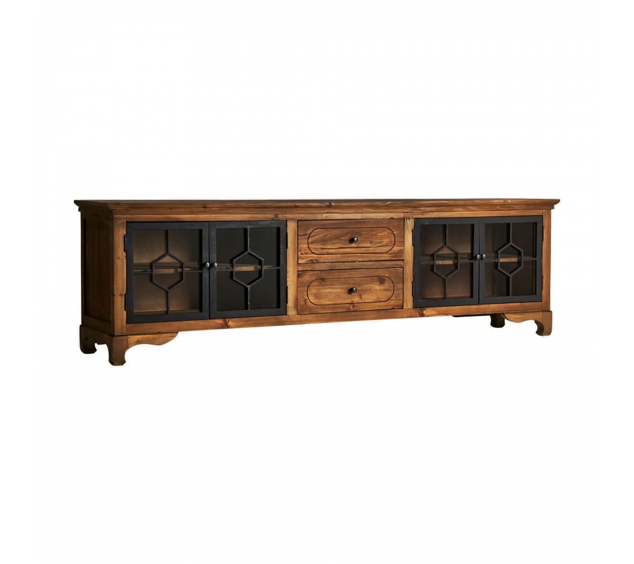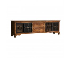 Vidiecky hnedý TV stolík Lavia Pine z masívu so železnými presklenými dvierkami a dvomi zásuvkami 220cm