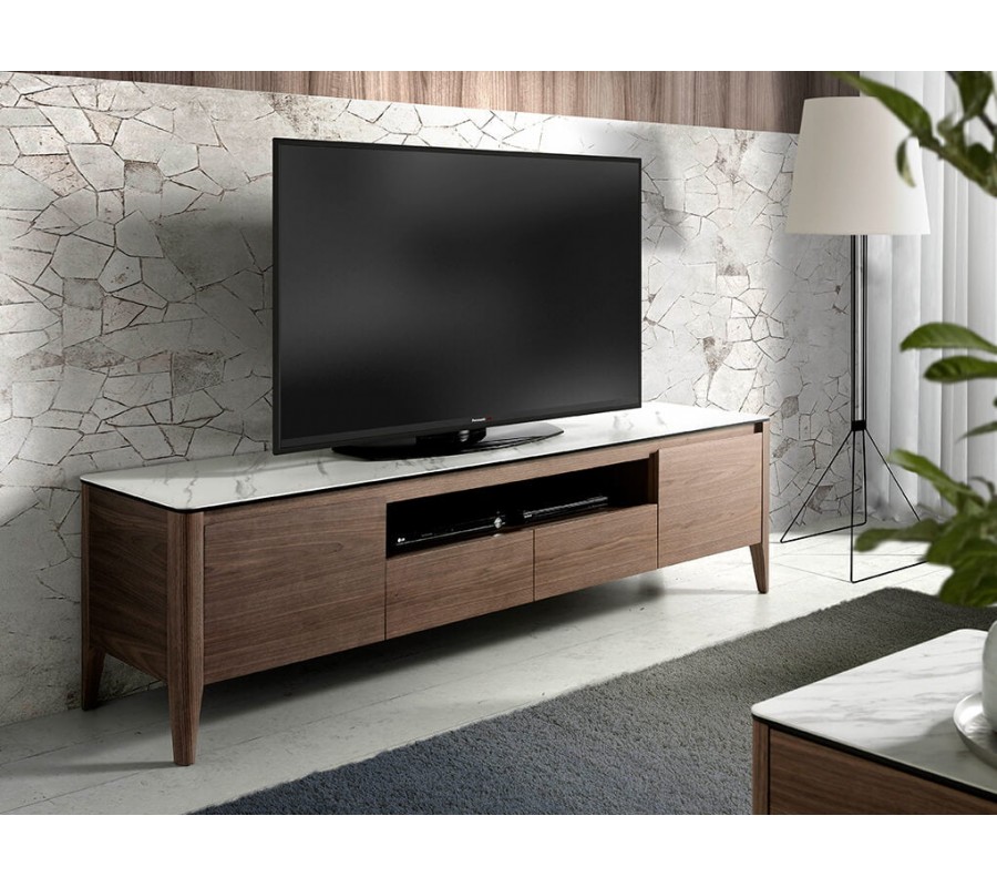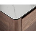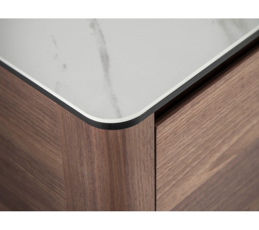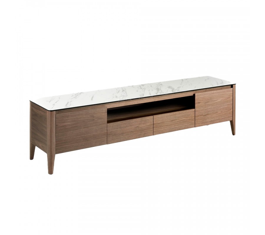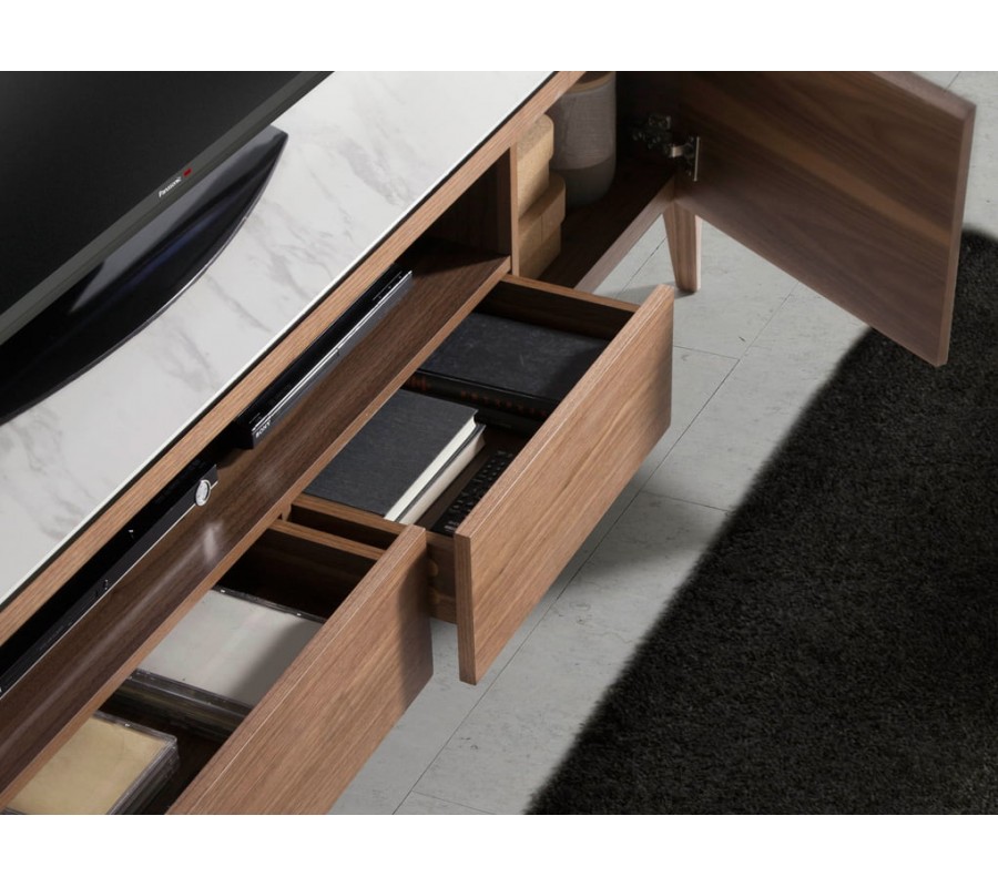 Drevené prevedenie TV stolíka Vita Naturale disponuje porcelánovou vrchnou doskou, ktorá sa nesie v bielom, nadčasovom mramorovom prevedení, vďaka ktorému získava svoj elegantný a luxusný nádych. Nadčasový, sofistikovaný dizajn TV stolíka Vita Naturale z orechového dreva dodá každej obývačke nádych moderného minimalizmu, ktorý zaručí ľahkú kombinovateľnosť s dreveným a koženým nábytkom v modernom štýle.