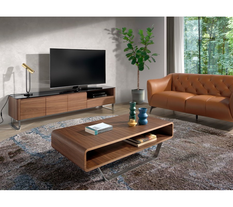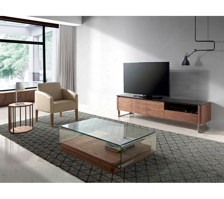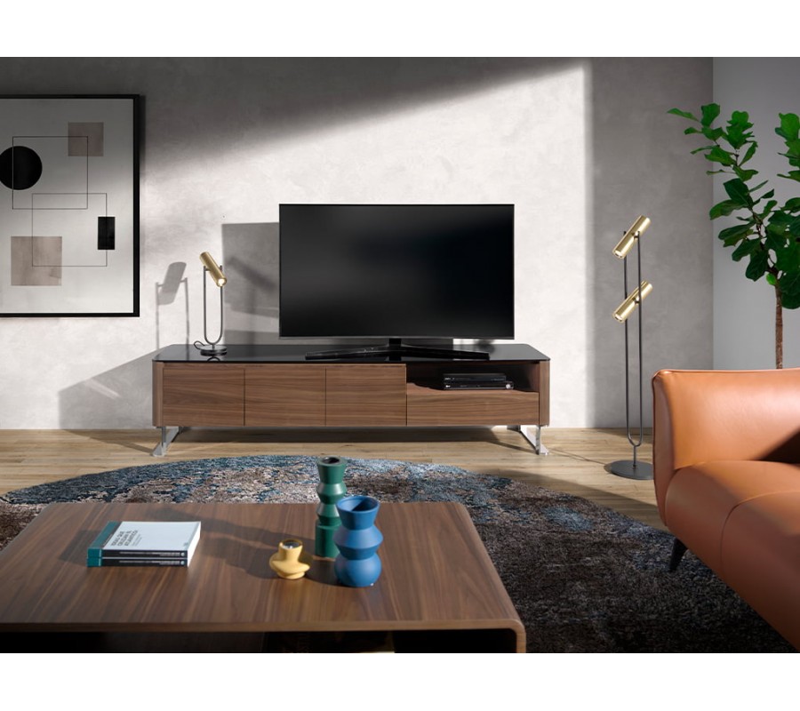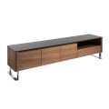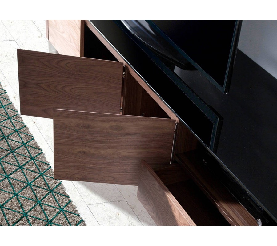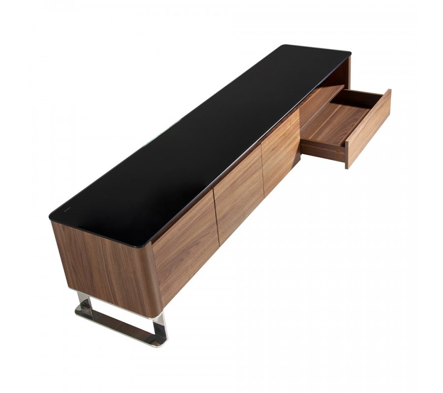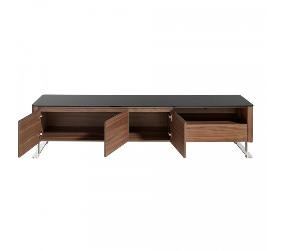 Náš televízny stolík z kolekcie Vita Naturale s čiernou sklenenou doskou je perfektným kusom nábytku s talianskym dizajnom, ktorý v sebe spája naturálny vzhľad s modernou sofistikovanosťou. Tento televízny stolík je vyrobený z kvalitných materiálov vrátane prírodného orechového dyhovaného dreva v hnedej farbe a chrómovaných nôh z nehrdzavejúcej ocele, čo zaručí že TV stolík Vita Naturale je rovnako odolný a trvácny ako štýlový.