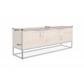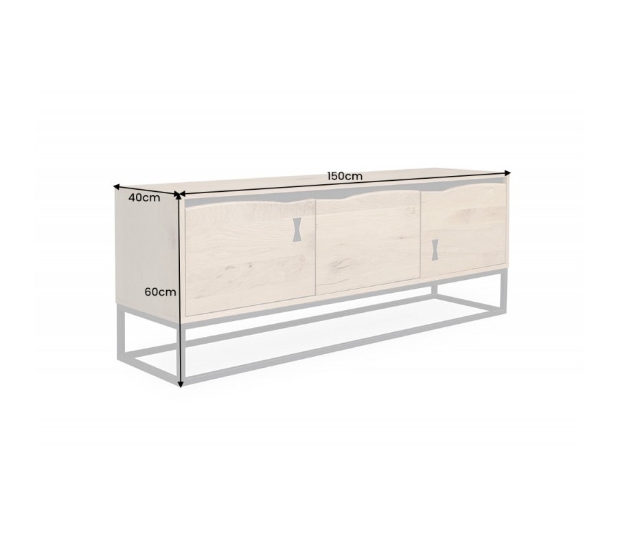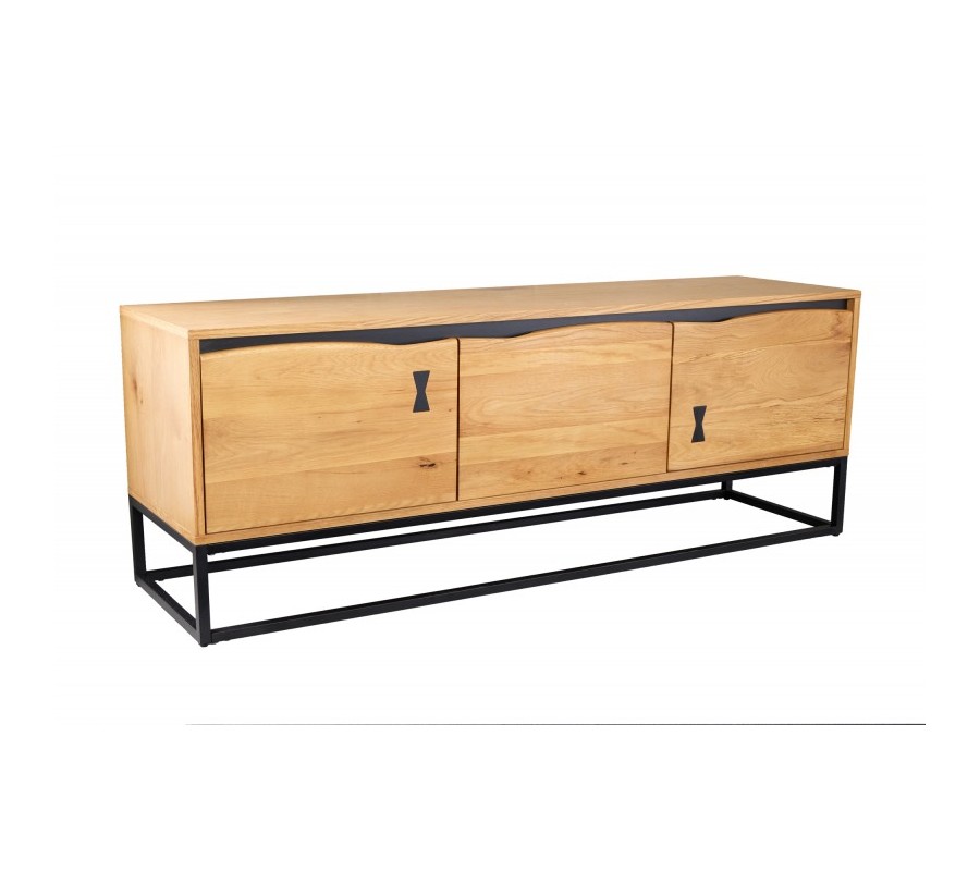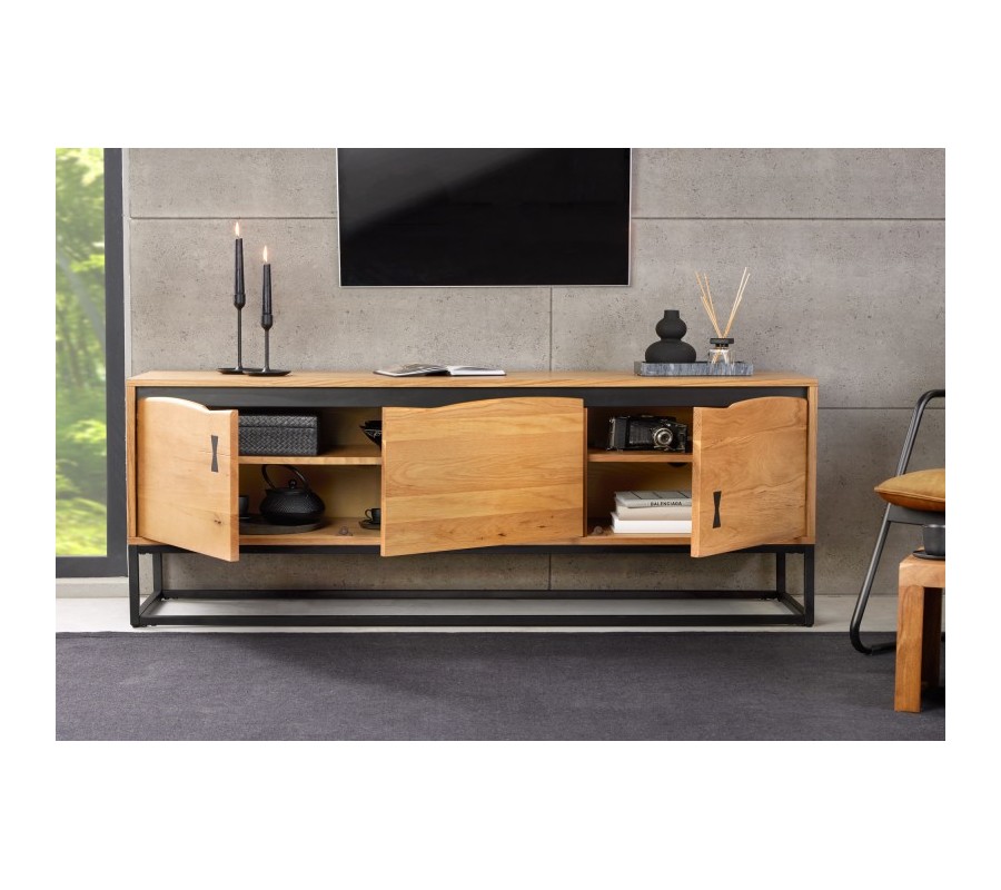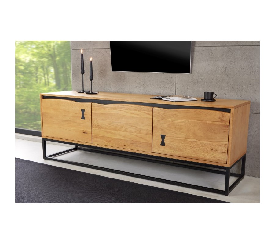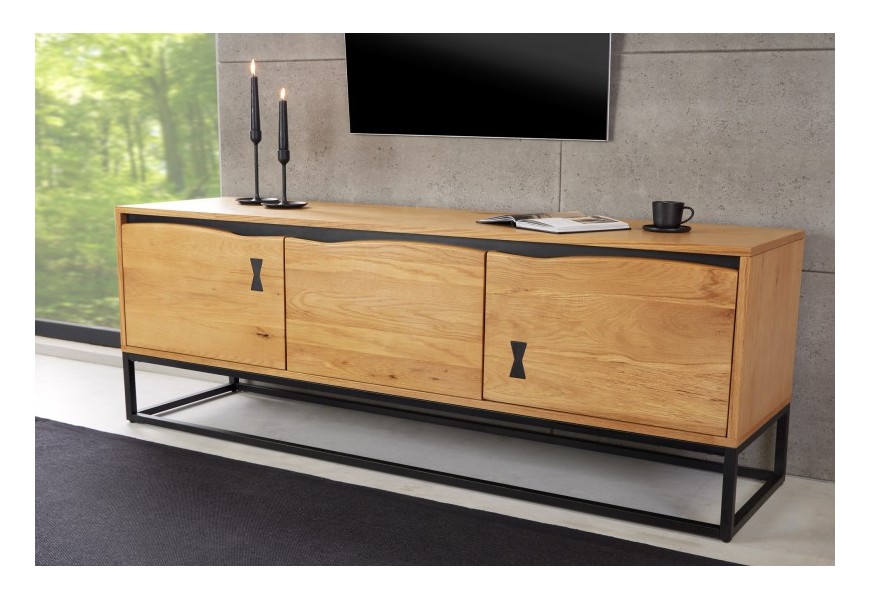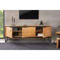 Masívny industriálny televízny stolík Mammut na čiernej konštrukcii s prírodnými hnedými dvierkami 160cm