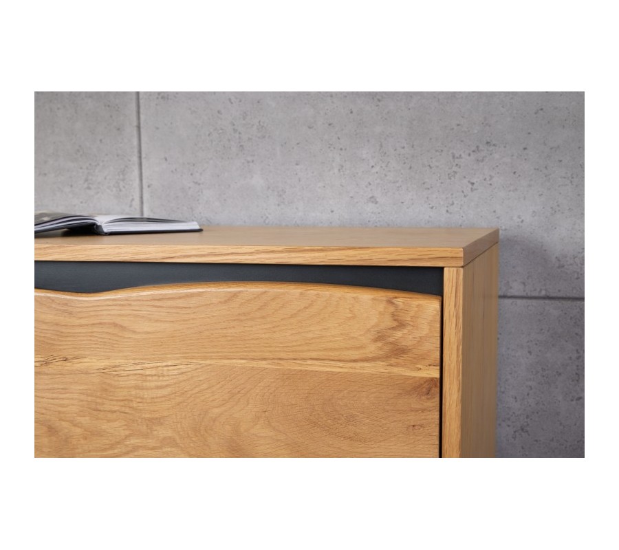 Sofistikované a elegantné prevedenie sprevádzané jemnými líniami tvorenými prechodom prírodnej hnedej farby drevennej časti a čiernej konštrukcie je signifikantným poznávacím znakom pre masívny televízny stolík Mammut. Dizajn sa nesie v industriálnom štýle a drevo s dubovým vzhľadom v svetlej hnedej farbe tvorí najpodstatnejšiu časť tela, keďže v sebe ukrýva úložný priestor so štyrmi priehradkami a nastaviteľnými poličkami uzavretými tromi dvierkami. Celý dojem dopĺňa čierna lišta pod hornou doskou a čierne úchyty v tvare presýpacích hodín. Stolík je postavený na kovovej konštrukcii v čiernej farbe s matným finišom, ktorá spája nožičky do podstavca, ktorý zabezpečuje stabilitu a pevnosť kúsku. Neutrálne farebné prevedenie si svoje miesto nájde v industriálne ladenej obývačke a v kombinácii s tapetou či obkladom pripomínajúcim tehlové steny v oranžovej či bordovej farbe a kovovými lustrami geometrických tvarov vytvorí tú pravú atmosféru industriálneho štýlu zariadania.