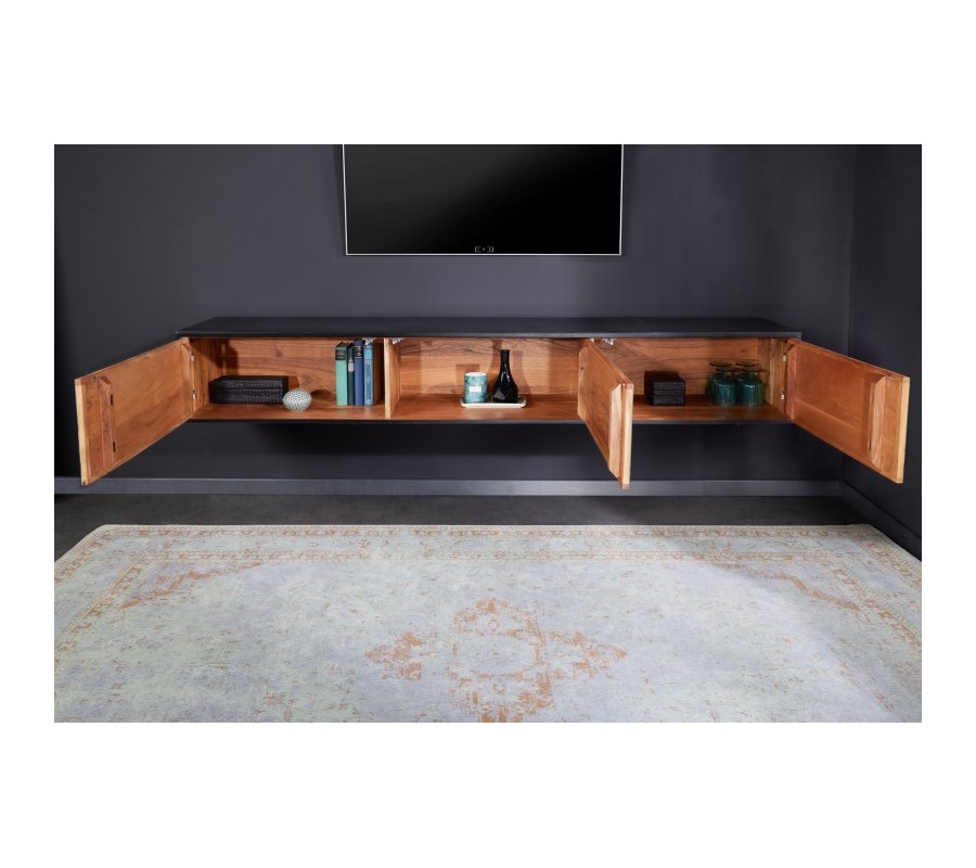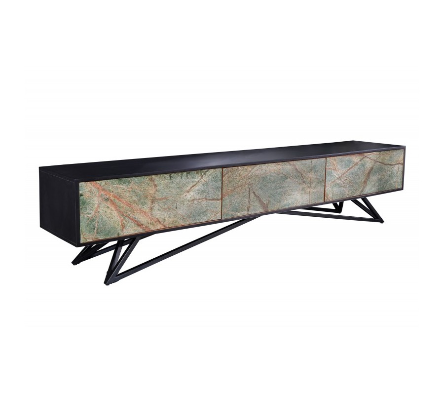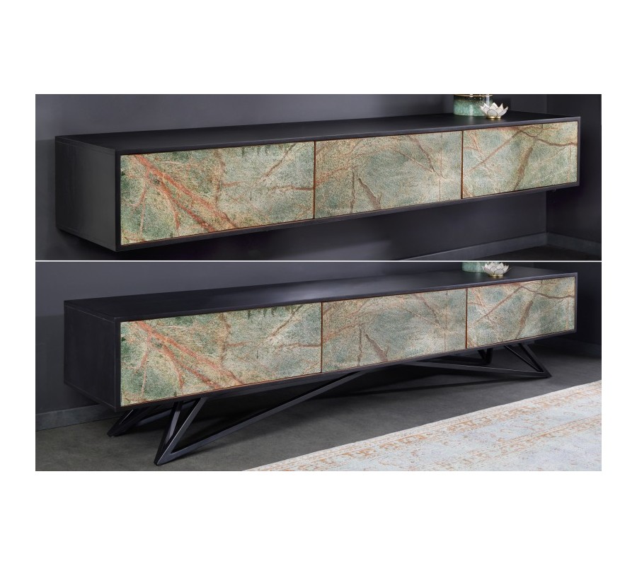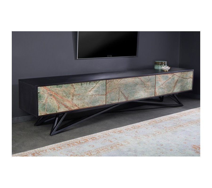 Dizajnový masívny TV stolík Elentia čiernej farby s kamennými dvierkami 200cm