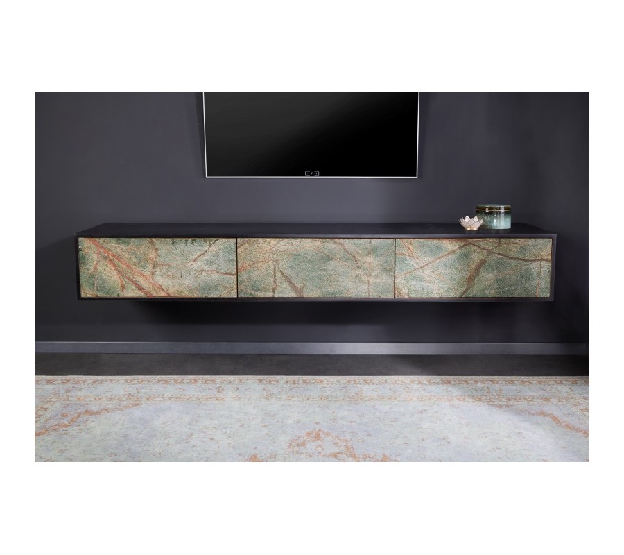 Nadčasový vzhľad TV stolíka Elentia zaujme všetkých milovníkov nevšedných kúskov nábytku, ktoré oživia a espetria interiér. Tento kúsok vo svojom dizajne kombinuje jednoduché geometrické tvary s kvalitnými materiálmi a estetickým vzhľadom, čím vzniká nadčasový kúsok vhodný do moderne ladených obývačiek. Jeho konštrukcia pozostáva z tela z masívneho dreva v čiernom prevedení a čiernych nožičiek z kovu križujúcich sa do zaujímavých geometrických tvarov. Dominantným prvkom dizajnu je však trojica dvierok s kamennou úpravou, ktorých povrch hrá odtieňmi zelenej, hnedej a krémovej v prirodzených abstraktných vzoroch. Vzniká tak unikátny a moderný vzhľad, ktorý vkusne doplní vaše priestory, či už ide o tmavšie alebo svetlejšie miestnosti. Praktický "push" systém otvárania dvierok umožňuje ich hladký, minimalistický vzhľad bez zbytočných rušivých elementov. Vnútro poskytuje otvorený úložný priestor rozčlenený na tri časti, ktorý sa nesie v prírodnej hnedej farbe. TV stolík Elentia je tak esteticky pôsobivým, ale i praktickým kúskom, ktorý sa stane stredobodom vašej obývačky!