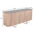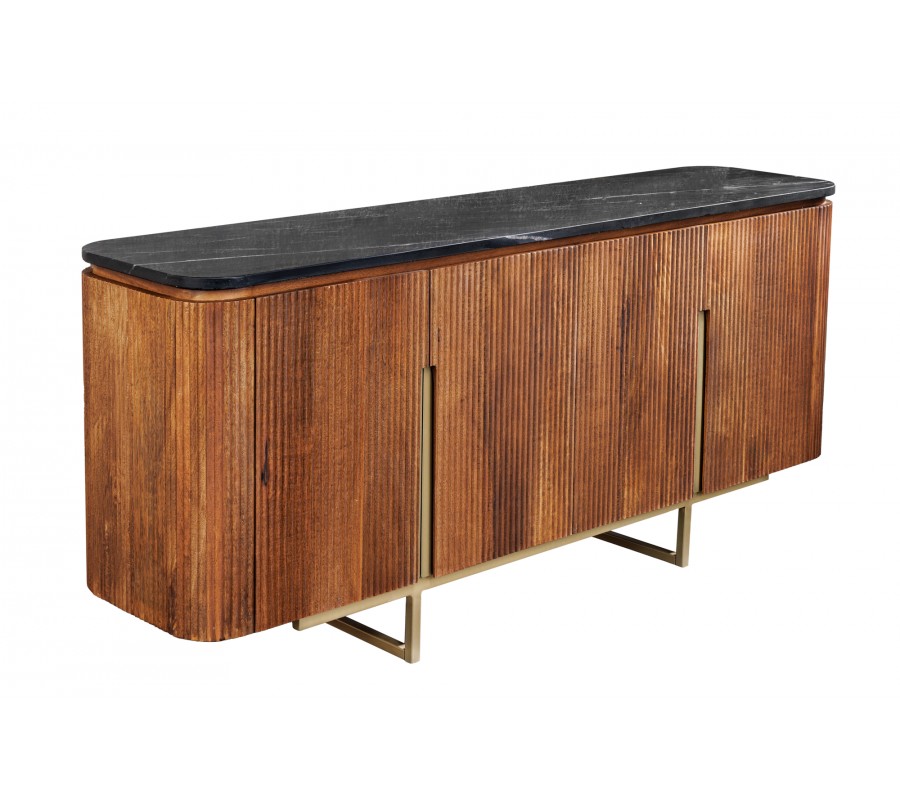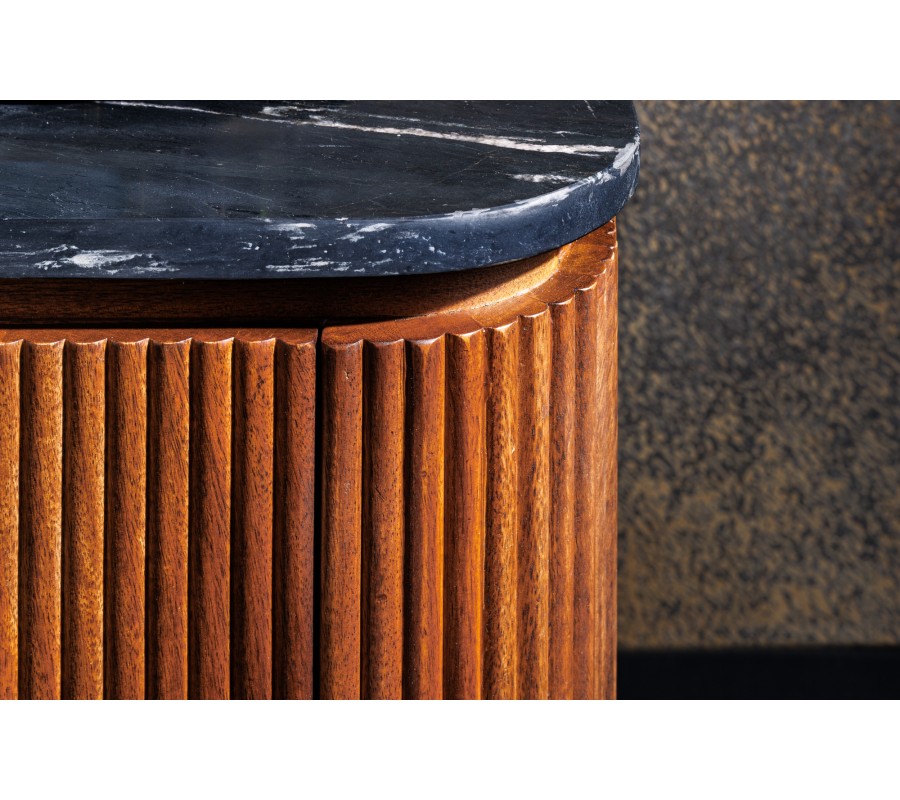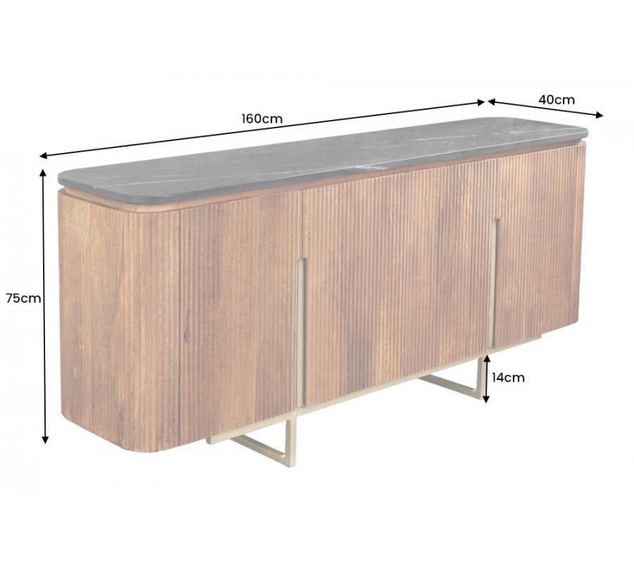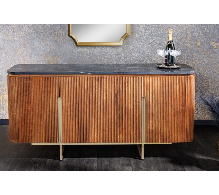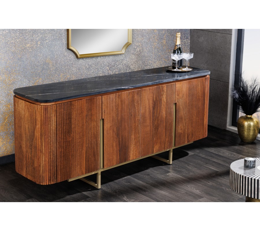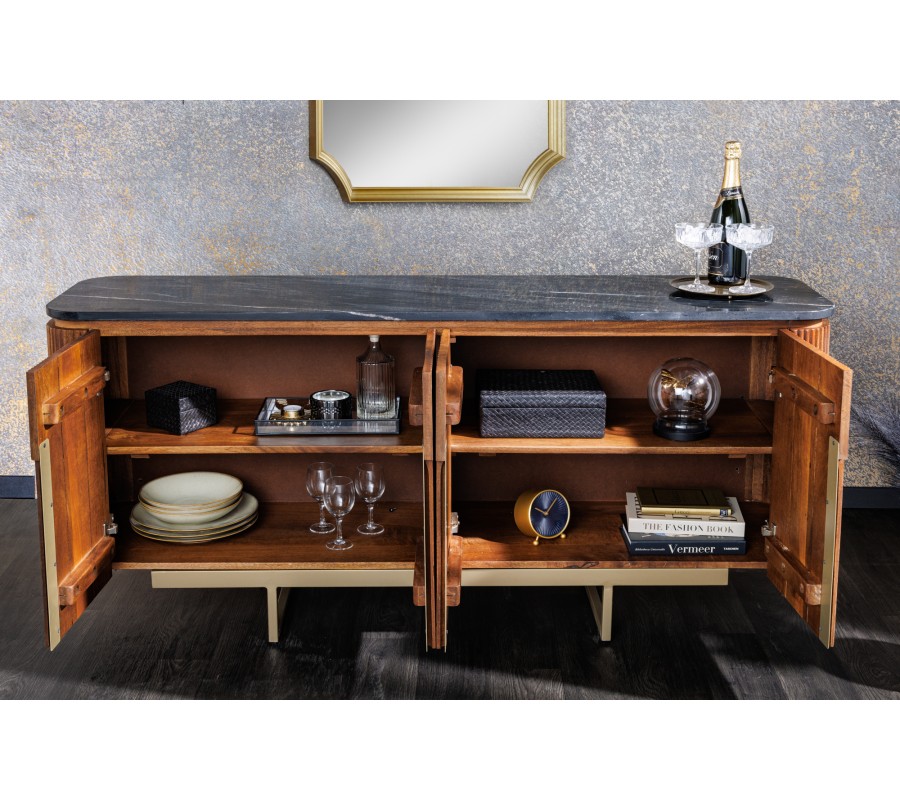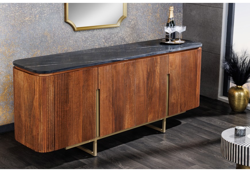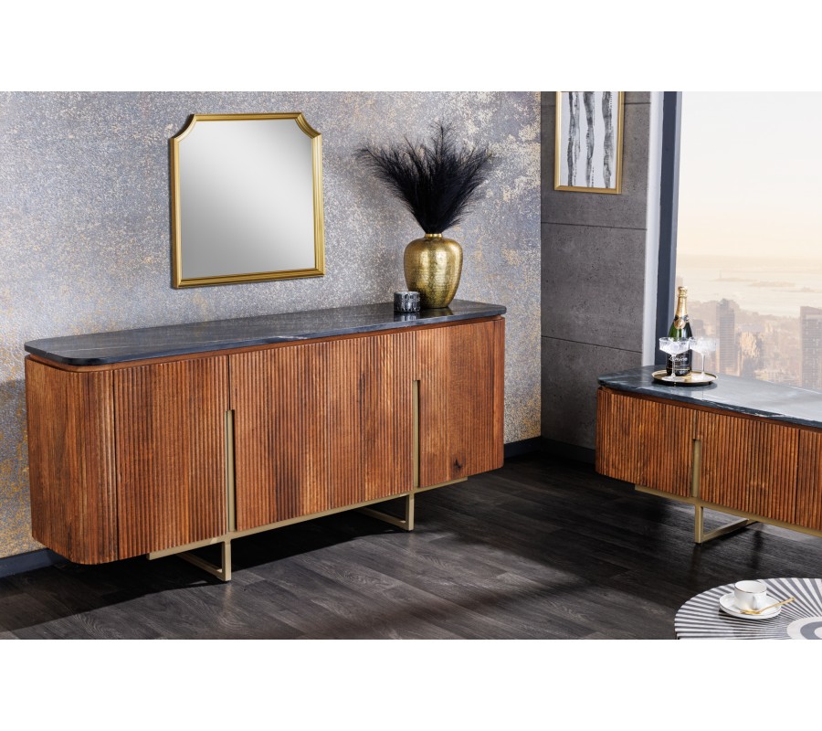 Dizajnový art deco príborník z kolekcie Gatsby je vyrobený z kvalitného mangového dreva a disponuje štyrmi nenápadnými dvierkami, ktoré skrývajú jednu poličku s dostatočným úložným priestorom. Výrazným a zaujímavým prvkom tohto televízneho stolíka sú zaoblené rohy, ktoré mu dodávajú moderný vzhľad s retro nádychom. Dizajn obvodu stolíka je vyskladaný z menších oblých látok, ktoré sú charakteristické pre túto kolekciu a robia ju jedinečnou a osobitnou. Tento stolík je nielen praktickým kusom nábytku, ale aj štýlovým doplnkom do vášho interiéru. Jeho dizajnové kovové nožičky v zlatej farbe sú viditeľné na povrchu dvierok, čo pridáva stolíku štýlový a luxusný vzhľad. Dizajn nožičiek sa plynule a nerušivo prenáša do prednej časti príborníka čím vytvára geometrický tvar, čo je jednou z hlavných čŕt art deco štýlu. Použitie mramoru a zlatá farba v kombinácií s tmavým mramorom a telom príborníka dávajú opulentný luxusný nádych. Klasická a príjemná hnedá farba, ktorá obklopuje celý stolík, dopĺňa mramorový dizajn vrchnej dosky, ktorá sa nesie v čiernej palete. Táto kombinácia farieb vytvára harmonický a elegantný vzhľad.