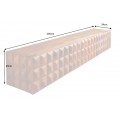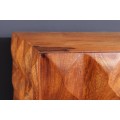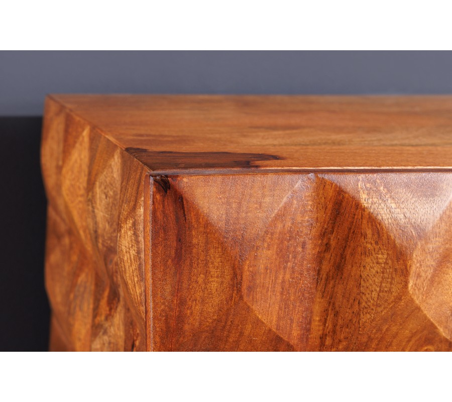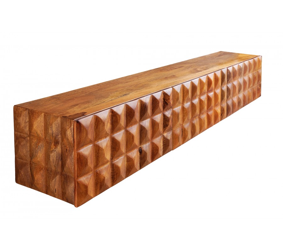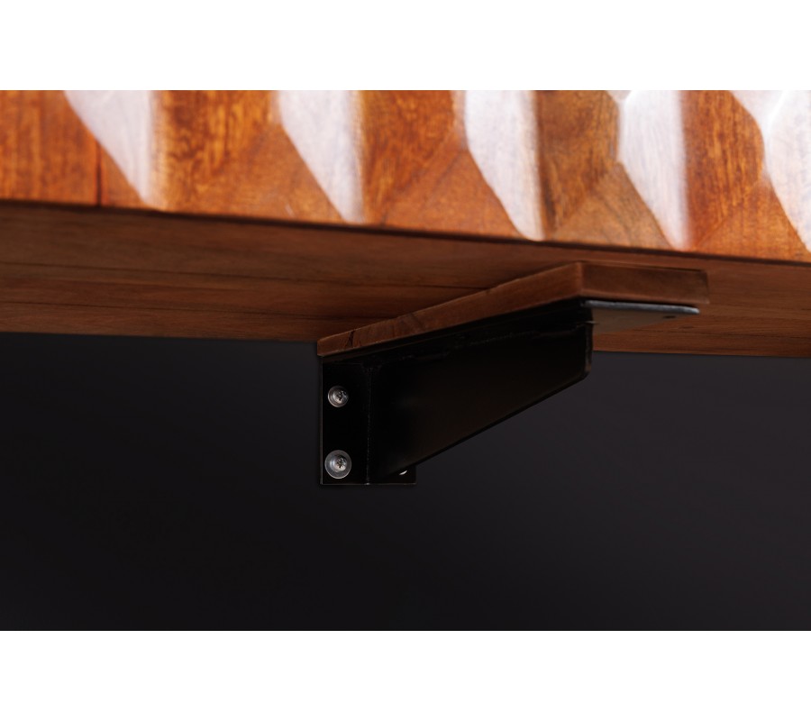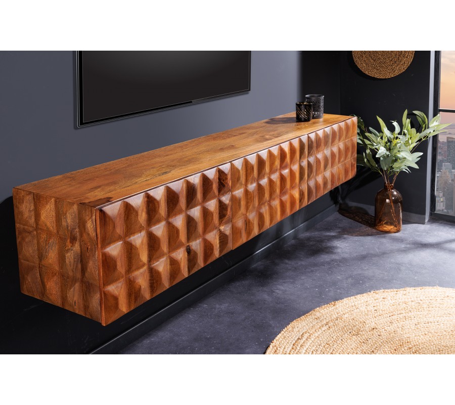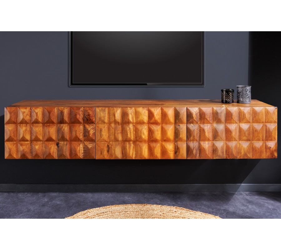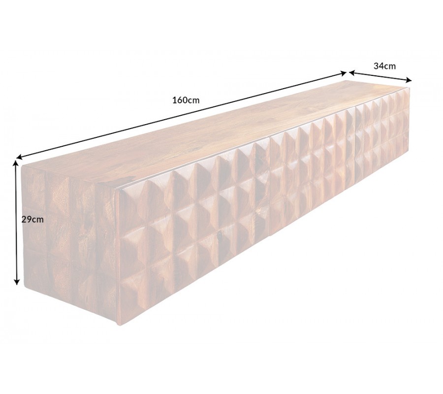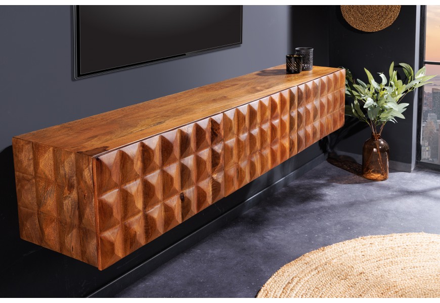 Dizajnový televízny stolík Vinan z masívneho dreva v teplej hnedej farbe má výrazný dizajn, ktorý zaujme v každej obývacej izbe ladenej tmavými farbami, ako sú šedá alebo čierna. Televízny stolík vytvára harmonickú kombináciu s interiérom v industriálnom alebo modernom štýle, najmä ak je doplnený masívnym nábytkom. Vďaka jeho drevenému vzhľadu sa hodí aj do obývačiek, v ktorých bude aj další nábytok z masívneho dreva v podobnom odtieni. Bočné strany stolíka sú vyzdobené 3D reliéfnym vzorom, ktorý svojimi obrúsenými hranami pripomínajú obrúsený kryštál či diamant, čo TV stolíku dodáva nevšedný a luxusný dojem. Stolík je nástenný bez nožičiek čo je jeho výhodou.
