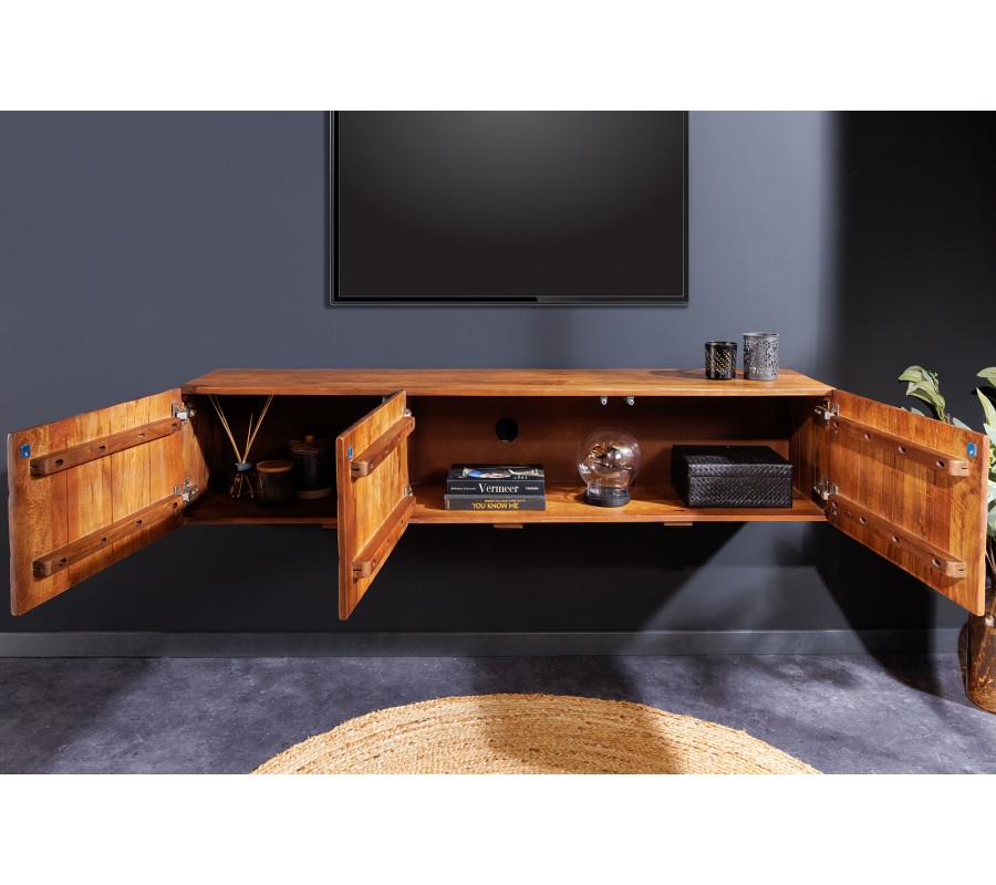 Dizajnový tv nástenný stolík Vinan z masívneho mangového dreva s tromi dvierkami 160 cm
