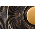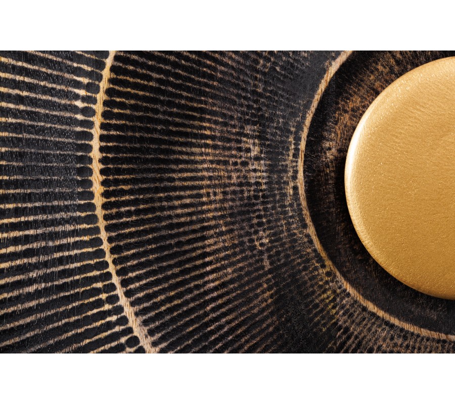 Stolík je postavený na štyroch kovových nožičkách v zlatej farbe, ktorých rohy sú elegantne zaoblené a ich povrch je hladký a jemne leský. Dvierka stolíka vytvárajú ornamentálny obrazec pripomínajúci slnko s lúčmi pričom stredný okrúhly detail slúži tiež ako úchytka pre stredové dvierka. Ornamenty sú vyrezávané do mangového dreva, ktorých povrch je pozlátený na čiernom pozadí, čo zvýraznuje celkový dizajn stolíka.