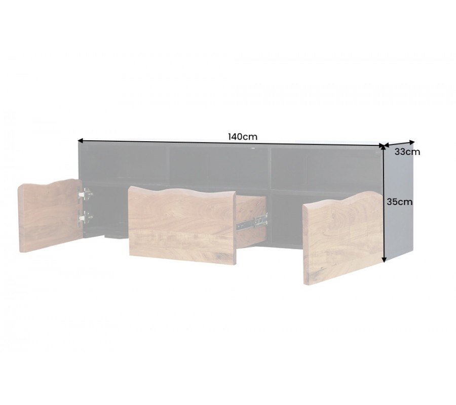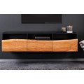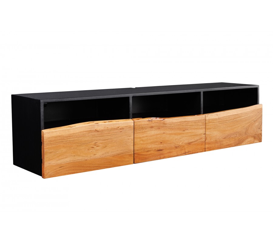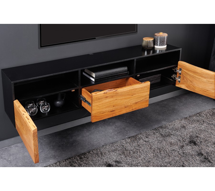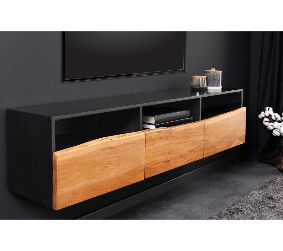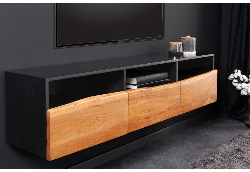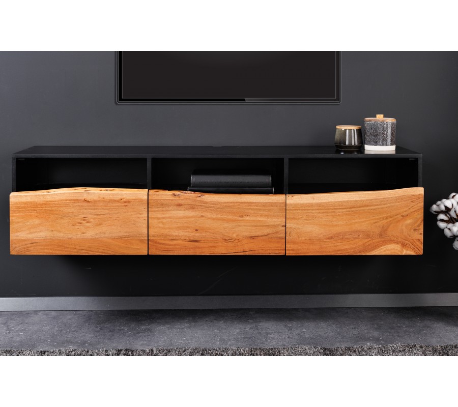 Dizajnový závesný čierny TV stolík Tallero s tromi zásuvkami a policami s prírodným hnedým masívny akáciovým prvkom 140 cm
