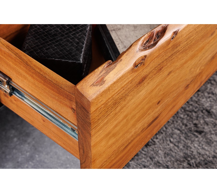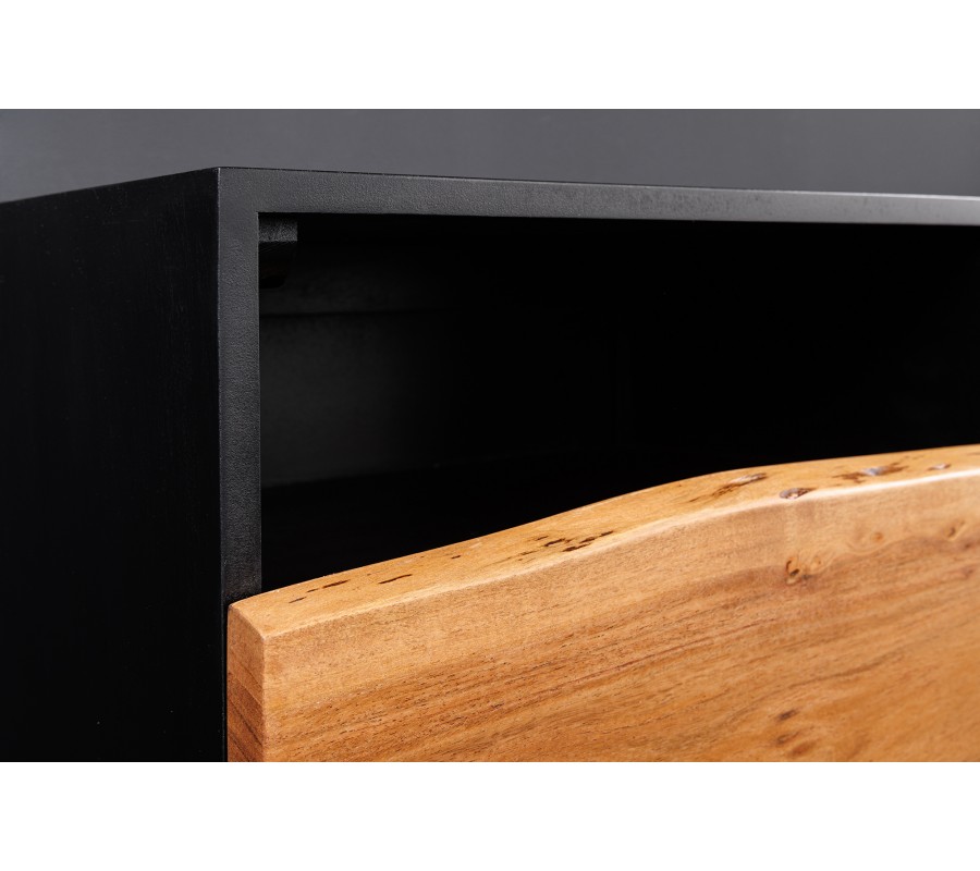 V dizajne prevažuje čierna farba, vytvárajúca pozadie pre masívny akáciový prvok, ktorý tvorí prednú stranu skriniek a zásuvky. Vrchná hrana sleduje prirodzenú štruktúru dreva a jej nepravidelný tvar vytvára kontrastný prvok k striktnej lineárnej siluete. Teplá medovo hnedá farba dreva s viditeľnou kresbou letokruhov dodáva nábytku naturálny charakter.