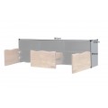 Silueta stolíka je moderná a lineárna. Nábytok sa upevňuje na stenu a absencia nožičiek ešte zdôrazňuje jednoduchý obdĺžnikový tvar. Takisto vám umožňuje umiestnenie presne do takej výšky, ako potrebujete. Vo vrchnej časti sa nachádzajú tri vedľa seba umiestnené police. Uzavretý úložný priestor poskytujú dve skrinky a jedna zásuvka umiestnená medzi nimi.