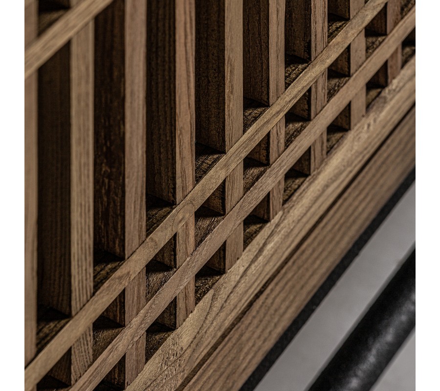 Dvierka sú vyplnené hranatými vertikálnymi lamelami a odstupy medzi nimi čiastočne odhaľujú interiér nábytku. Tento dizajn je inšpirovaný východnou Áziou. Naturálne drevo a lineárne motívy často zdobia napríklad japonské ryokany.