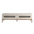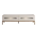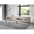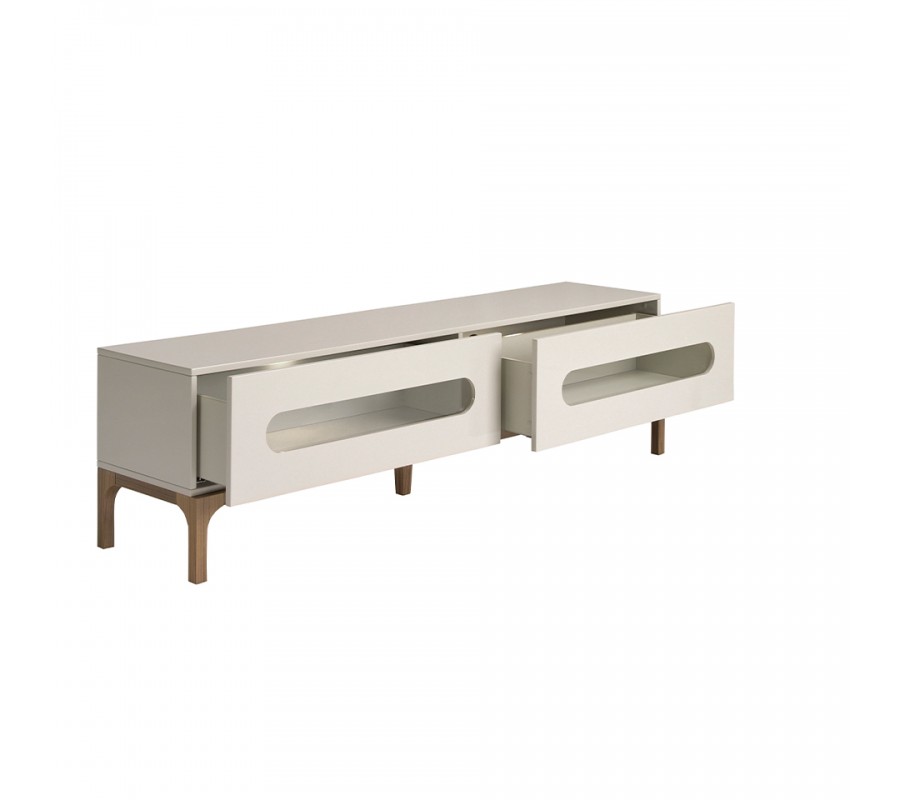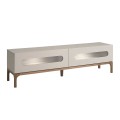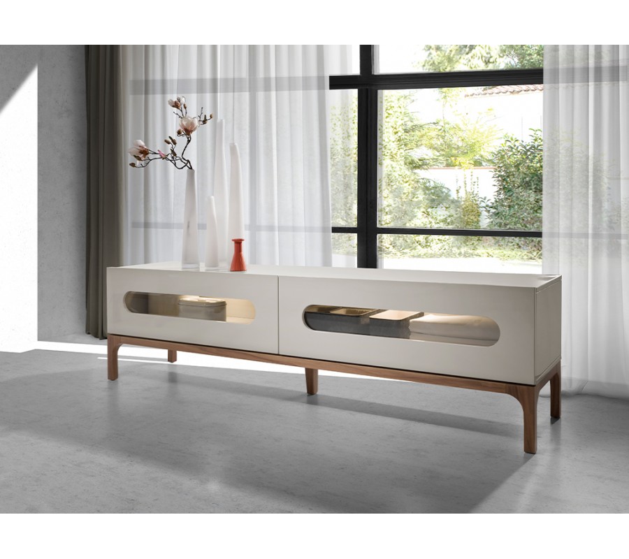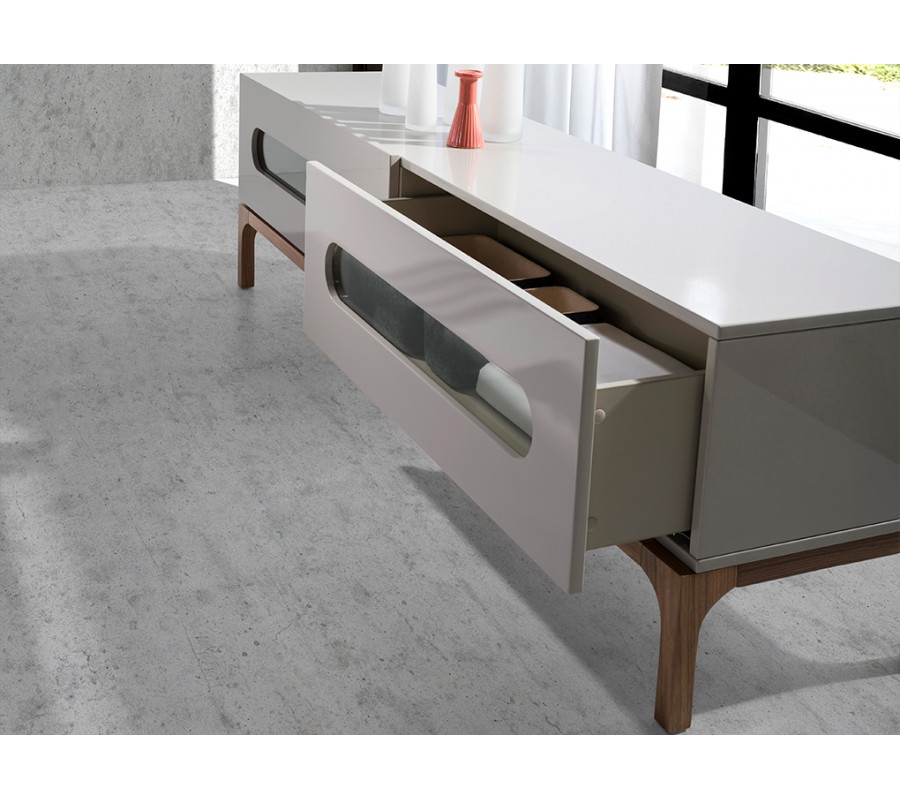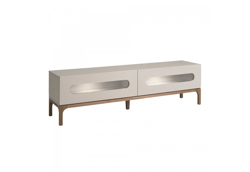 Luxusný moderný televízny stolík Forma Moderna s dvomi zásuvkami v lesklej sivej farbe s prírodnými hnedými nožičkami 180 cm
