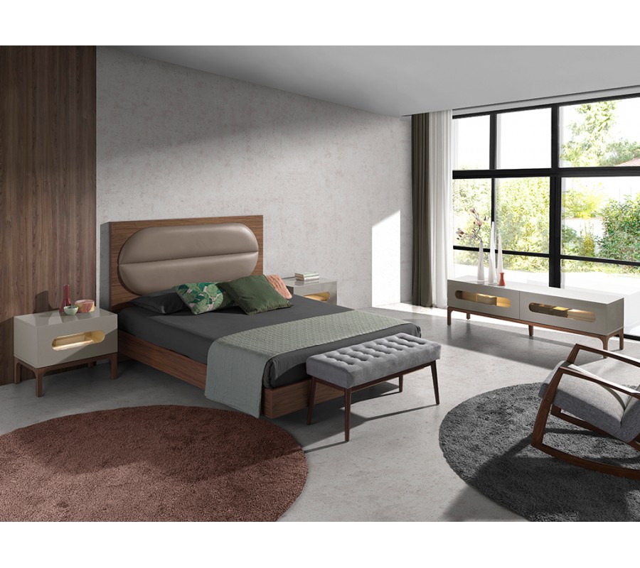 Podstava stolíka je tvorená štyrmi nožičkami na rohoch a jednou dodatočnou nožičkou v strede. Bočné nožičky sa v elegantnom oblúku, ktorý korešponduje s priezorom na zásuvkách, pripájajú na lineárnu podstavu, nesúcu úložný priestor. Majú prírodnú hnedú farbu orechového dreva, ktorá prináša do dizajnu pocit tepla. Skvele dopĺňajú hladký lakovaný povrch vrchnej časti v sofistikovanom oblačnom sivom odtieni.
