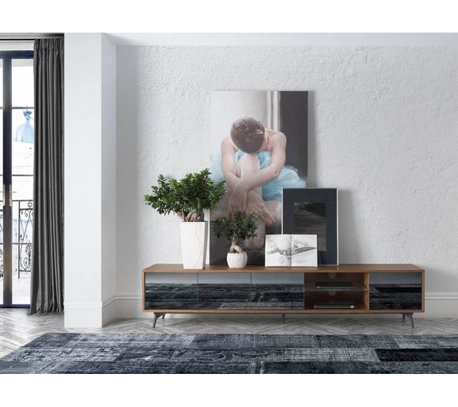 Luxusný moderný TV stolík Forma Moderna z hnedého orechového dreva s policou a štyrmi čiernymi zrkadlovými dvierkami 240 cm