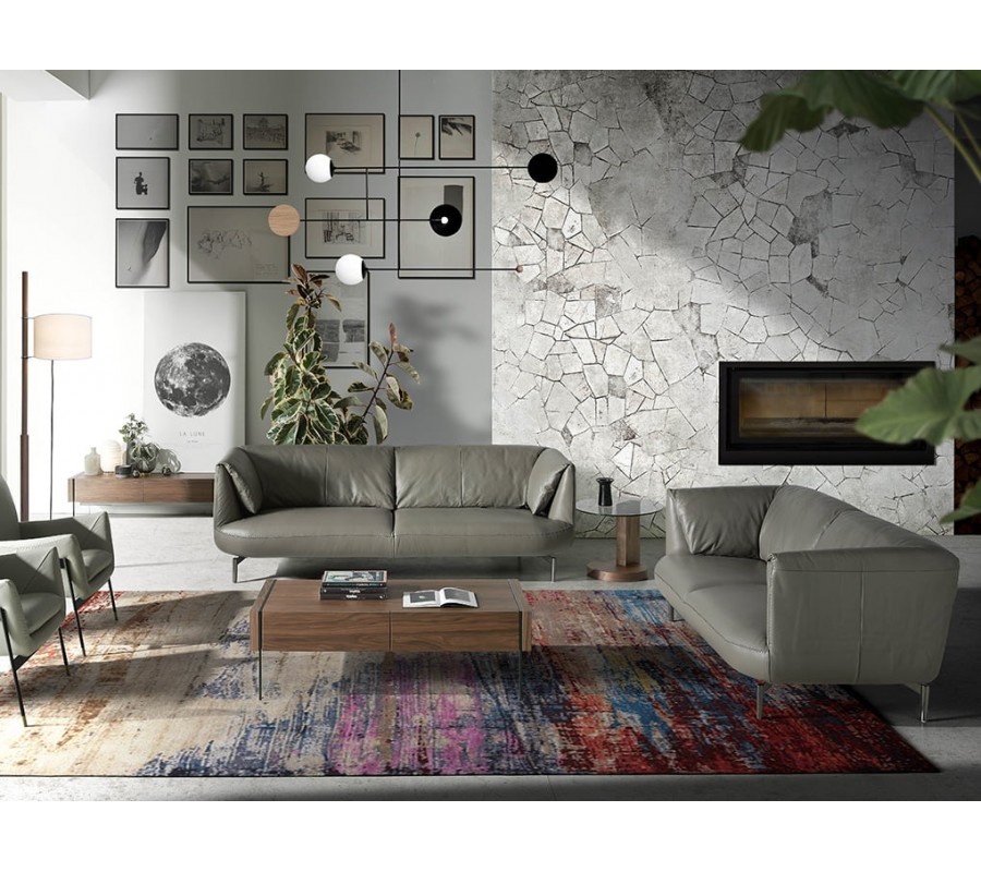 V siluete nábytku dominujú striktné rovné línie a pravé uhly. Na hladkých povrchoch vyniká jemná kresba letokruhov orechového dyhovaného dreva. Jeho bohatá svetlá hnedá farba pôsobí luxusným dojmom a v miestnosti vyvolá pocit tepla. V sofistikovanom konraste k tomuto prírodnému materiálu sú  moderné nožičky stola. Tvoria ich dva pláty bezpečnostného skla, upevnené pomocou drevenej dosky k úložnému priestoru na kratších stranách. Vďaka priehľadnosti skla nadobúda stolík ľahký a vzdušný vzhľad. Vzniká ilúzia, akoby drevená časť plávala vzduchom.