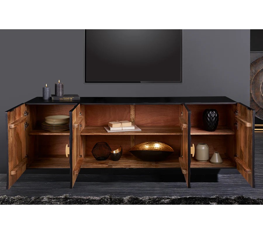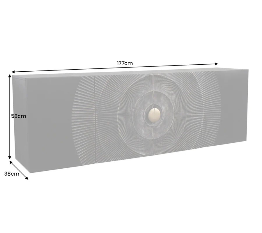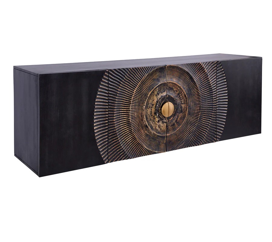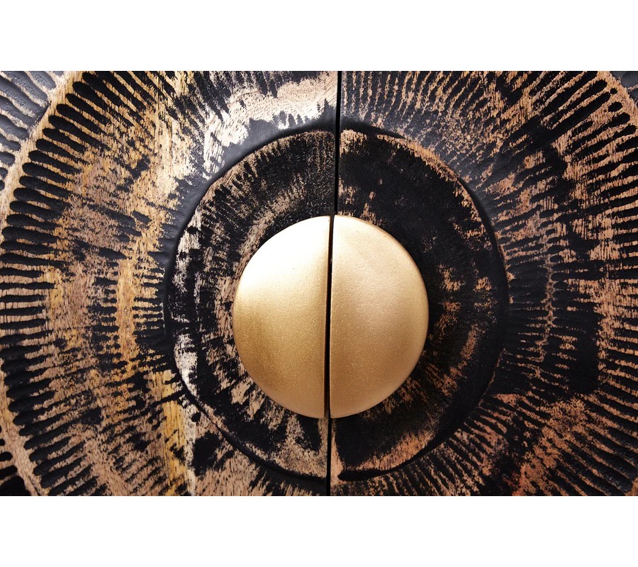 Príborník s obdĺžnikovým tvarom je vyrobený z mangového dreva, ktoré vyniká svojou odolnosťou a prirodzenou štruktúrou. Povrch je ladený do tmavej čiernej farby s matným nádychom, pričom dvierka sú zdobené detailným reliéfom v zlatom odtieni, ktorý vytvára abstraktný obraz sústredených kruhov pripomínajúcich slnečné lúče. Táto kombinácia farieb a vzorov dodáva nábytku jedinečný glamour štýl.