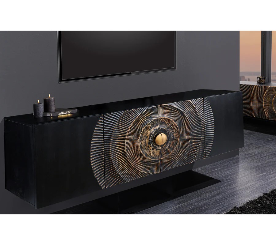 Štýlový štvordverový art deco nástenný tv stolík Cumbria v čiernej farbe so zdobeným zlatým reliéfom na dvierkach 180 cm