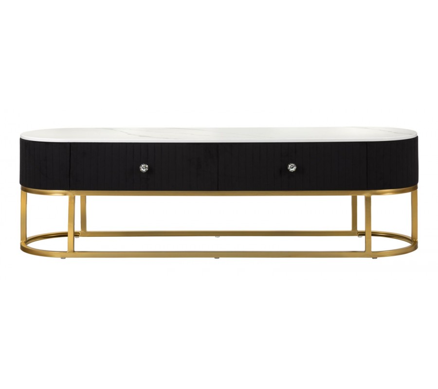 TV stolík Glamia Tapisé zaujme na prvý pohľad svojim zaobleným, obdĺžnikovým, podlhovastým tvarom a prepychovým vzhľadom. Korpus je potiahnutý zamatovou látkou v čiernej farbe, pričom na jej povrchu sú viditeľné zvislé prešívané línie, ktoré vytvárajú elegantný prúžkovaný efekt. Vpredu sa nachádzajú dve zásuvky s okrúhlymi, kryštálovo pôsobiacimi úchytkami, ktoré dodávajú stolíku noblesný šmrnc.