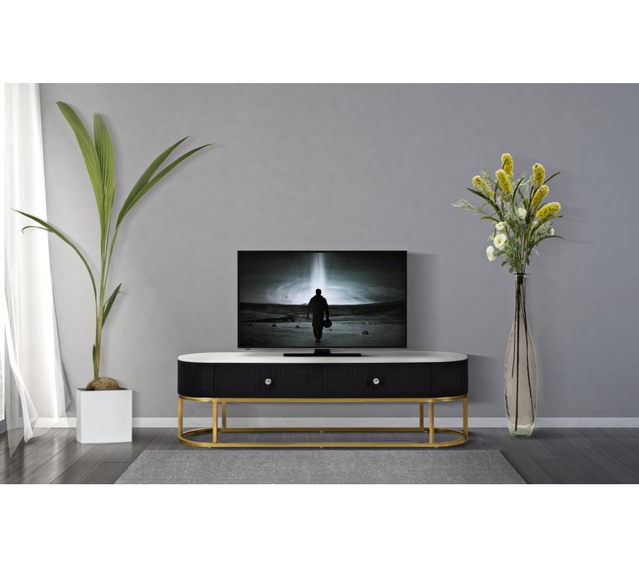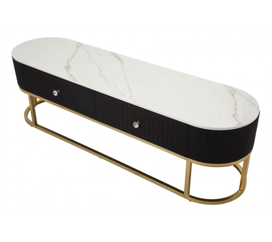 Luxusný art deco čierny TV stolík Glamia Tapisé so zlatou konštrukciou s dvomi zásuvkami a doskou s mramorovým dizajnom 150 cm