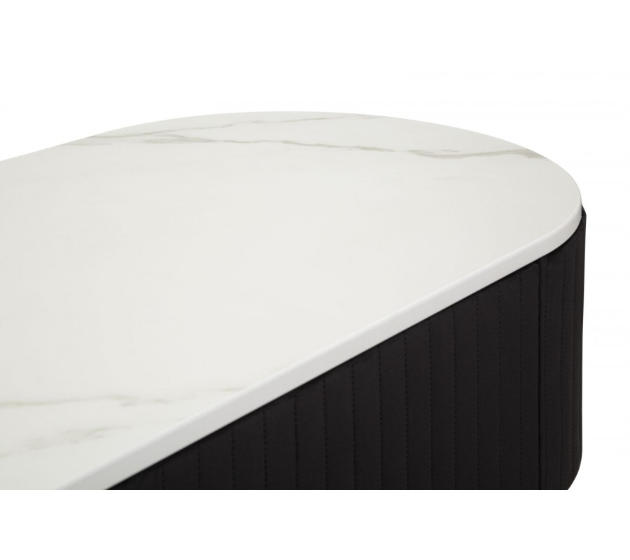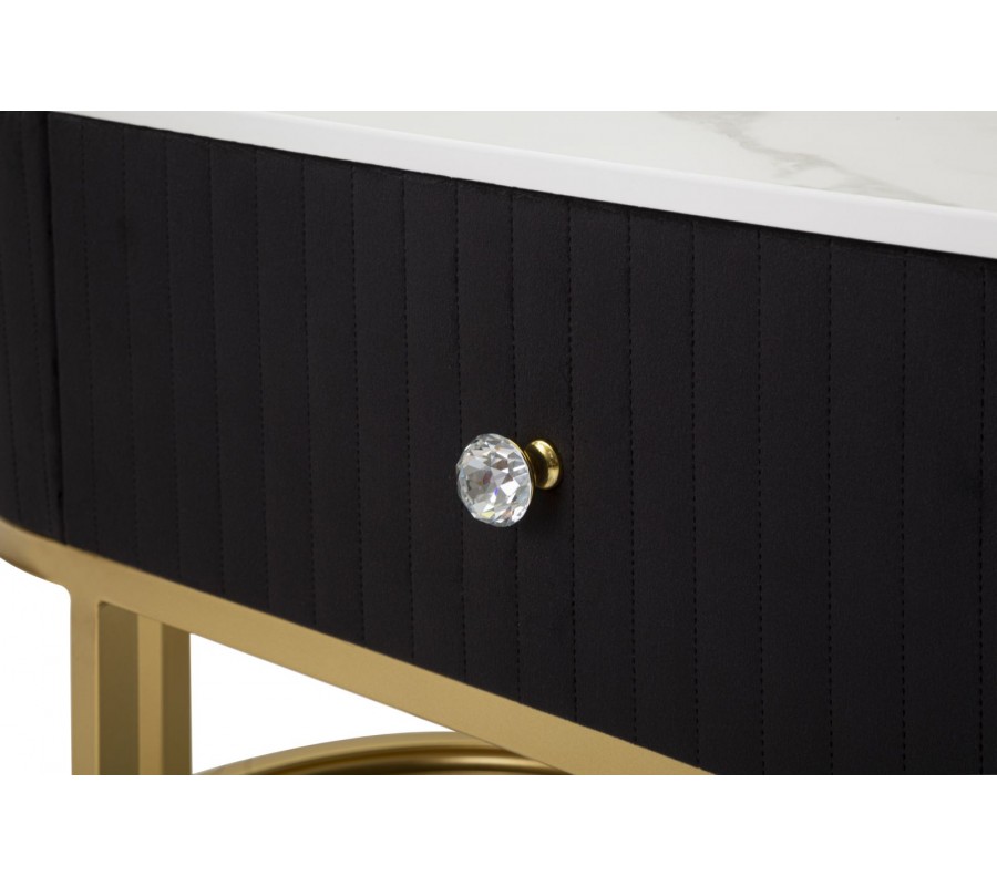 Vrchná doska je vyhotovená z dreva s mramorovým dizajnom s jemnými šedými žilkami, čo vytvára výrazný kontrast k čiernemu zamatovému povrchu. Celý vrch je podopretý zlatou kovovou konštrukciou, ktorá má oválny tvar a pridáva stolíku stabilitu aj luxusný nádych.