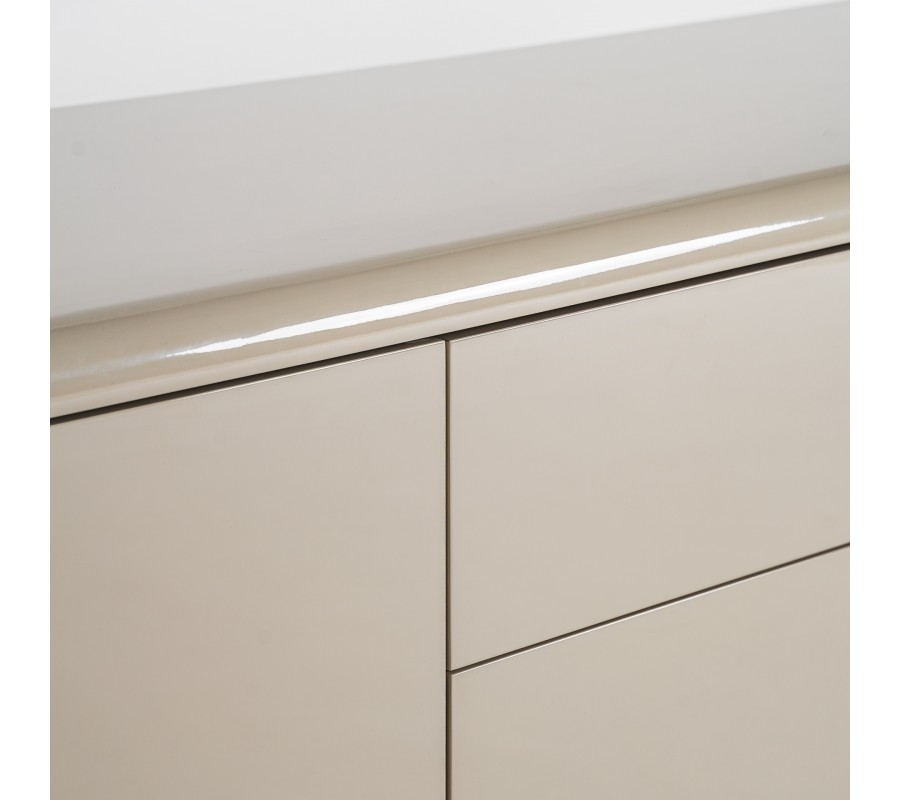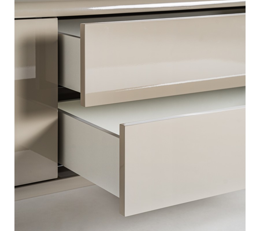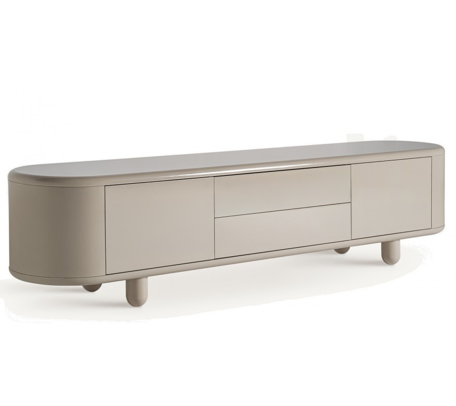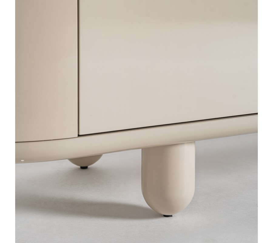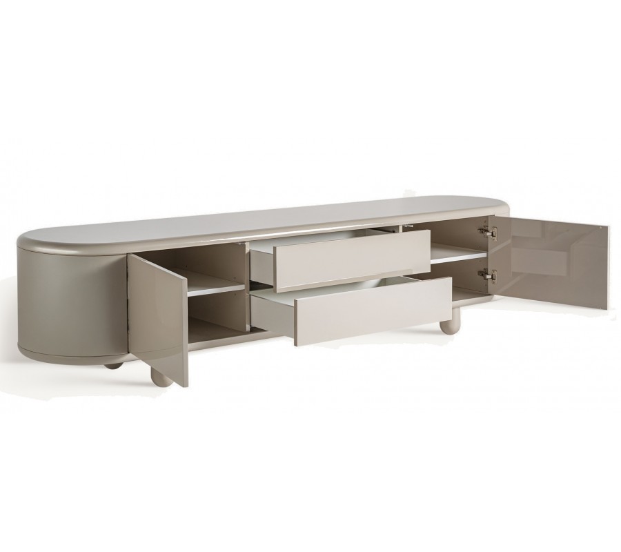 Luxusný béžový moderný TV stolík Lorian oblého tvaru s úložným priestorom s lesklým povrchom s oblými nožičkami 240 cm