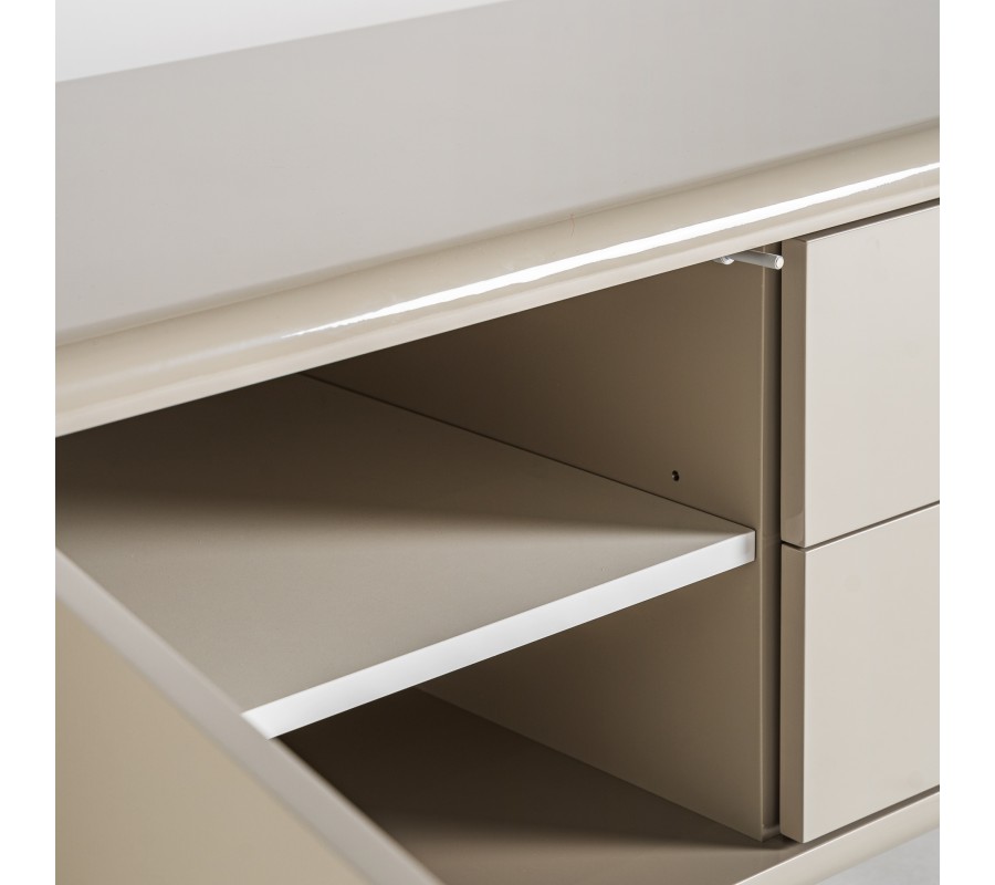 TV stolík Lorian spája precízne remeselné spracovanie s luxusným moderným dizajnom. Zaoblená konštrukcia z dreva v elegantnej béžovej farbe s lesklou povrchovou úpravou vytvára dojem nadčasovej elegancie.