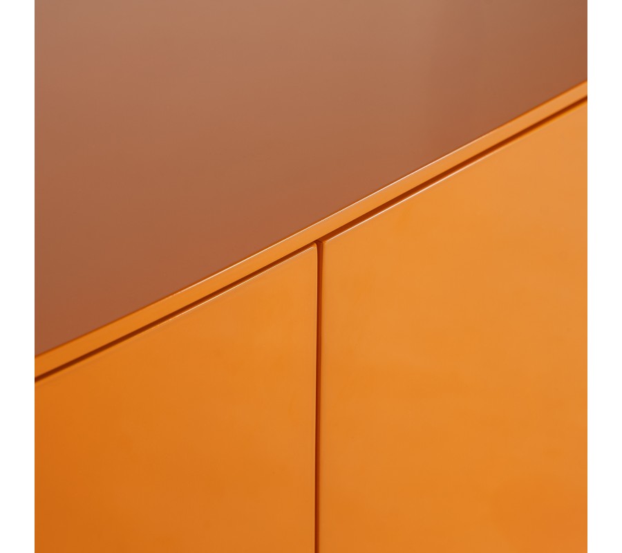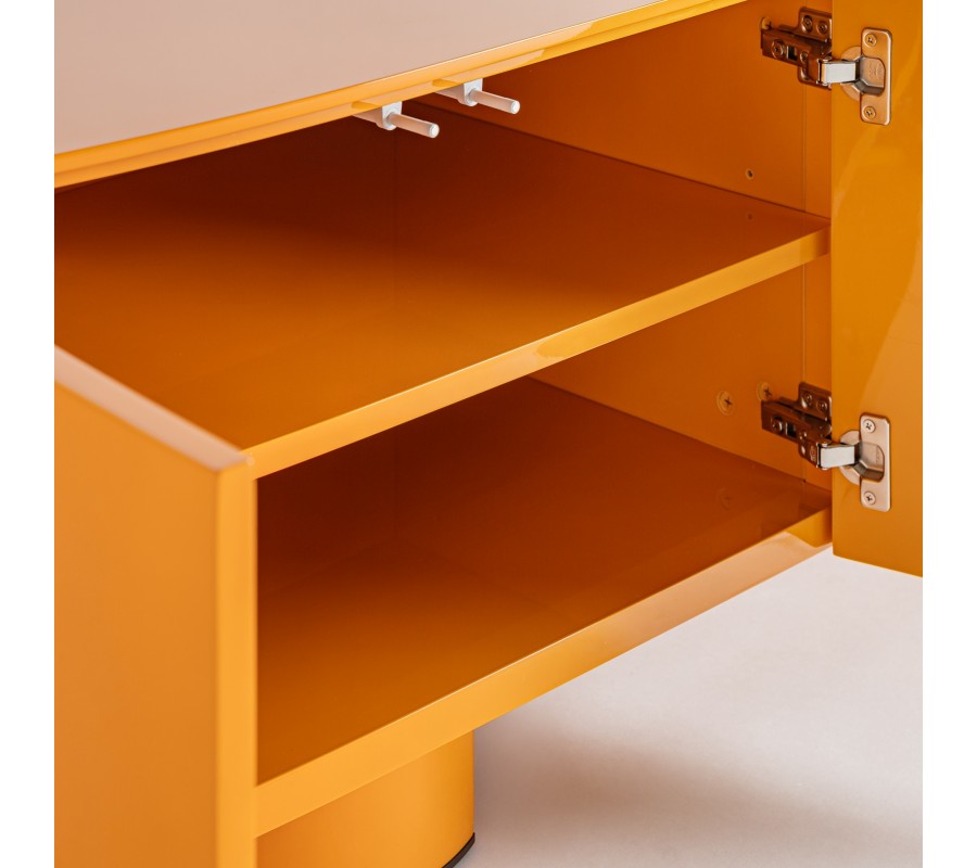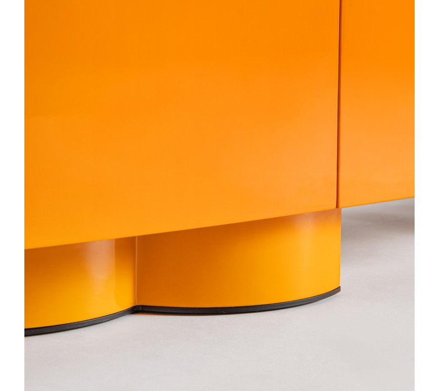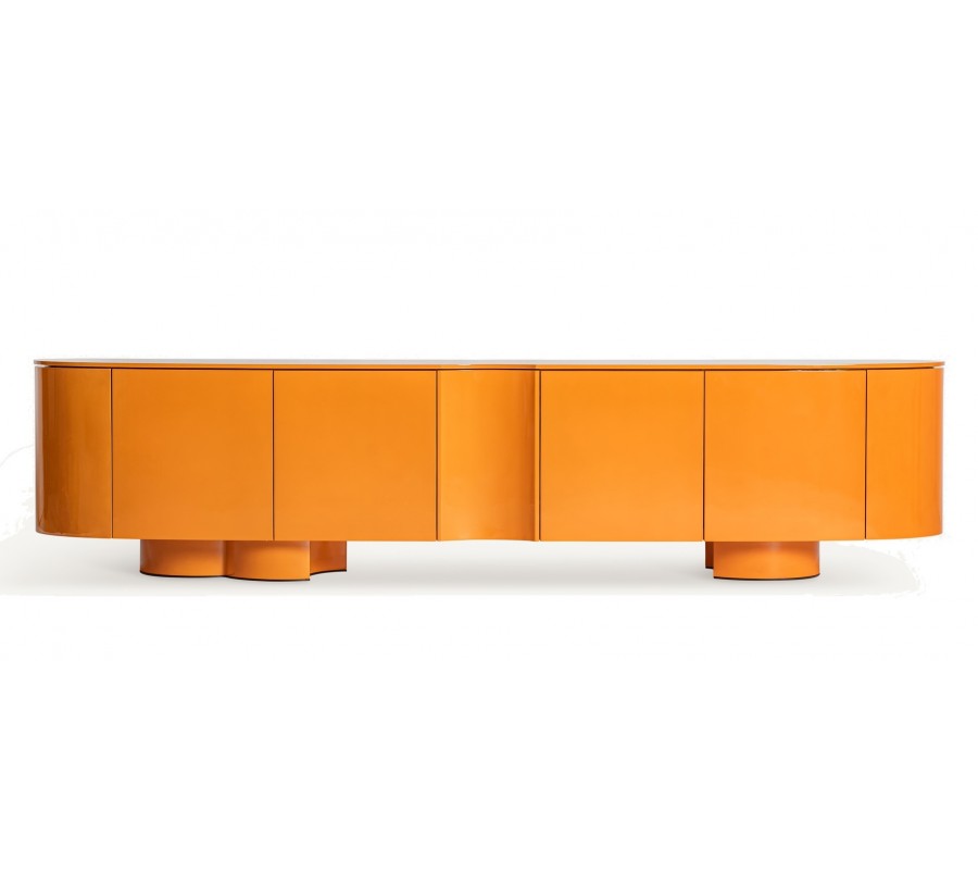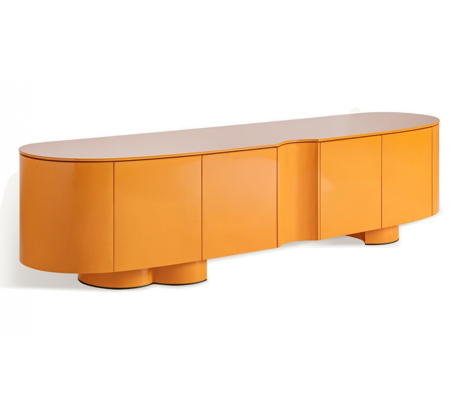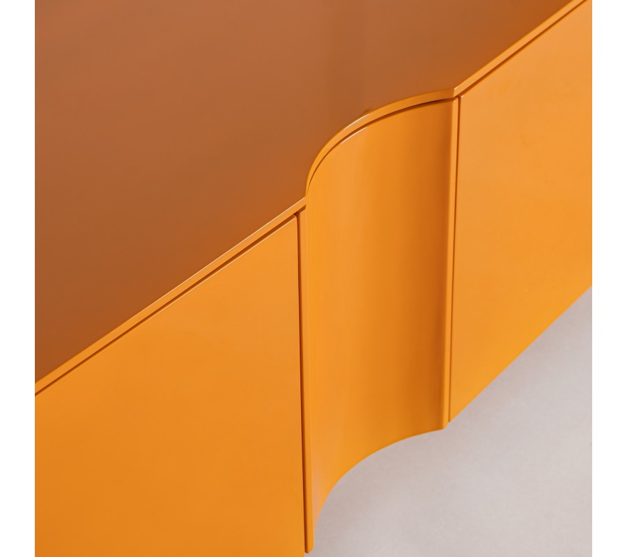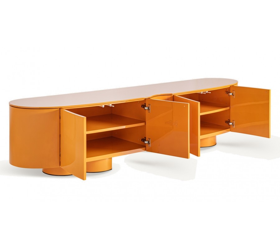 Art deco oranžový oválny štvordverový TV stolík Munios s lesklým hladkým povrchom s oblými hranami a oválnymi nožičkami 220 cm