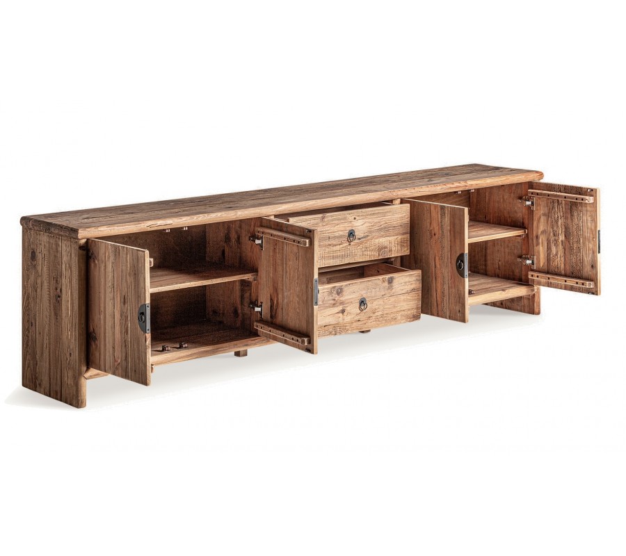 Tento luxusný TV stolík má štyri dvierka a dve priestranné zásuvky, ktoré poskytujú veľkorysý úložný priestor na uschovanie multimediálnych zariadení, ovládačov či doplnkov. Dvierka sú vybavené čiernymi kovovými úchytkami v tvare krúžkov, ktoré podčiarkujú autentický vintage vzhľad a zároveň umožňujú pohodlnú manipuláciu. Dve malé hranaté nožičky pod korpusom dodávajú stolíku elegantný vzhľad a mierne ho odľahčujú.