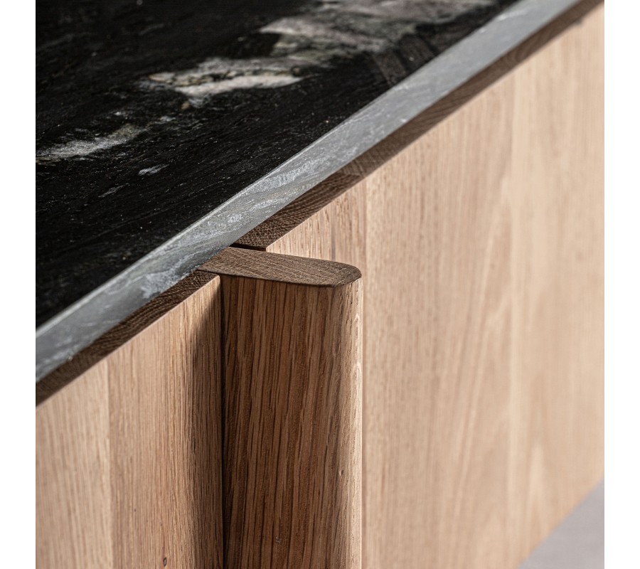 Luxusný TV stolík Naria v škandinávskom štýle spája prírodnú eleganciu masívneho dubového dreva s luxusnou mramorovou doskou. Obdĺžnikový tvar s jemne zaoblenými rohmi dodáva stolíku harmonický vzhľad a nadčasový dizajn. Vrchná doska z čierneho mramoru s bielymi žilkami vytvára sofistikovaný kontrast k hnedej farbe dreva s výraznou štruktúrou letokruhov, ktorá zvýrazňuje autentický charakter prírodného materiálu.
