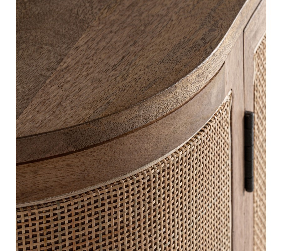 Dizajn zjemňujú zaoblené rohy a štýlové prútené panely s viedenským výpletom z dreveného vlákna v béžovej farbe, ktoré sa nachádzajú nielen na dvierkach, ale aj na bočných stranách stolíka. Štyri skrinkové dvierka ukrývajú dve vnútorné poličky, ktoré ponúkajú dostatok priestoru na uloženie elektroniky či doplnkov. Dvierka sú doplnené o okrúhle kovové úchytky v zlatej farbe, ktoré dodávajú celku luxusný nádych.