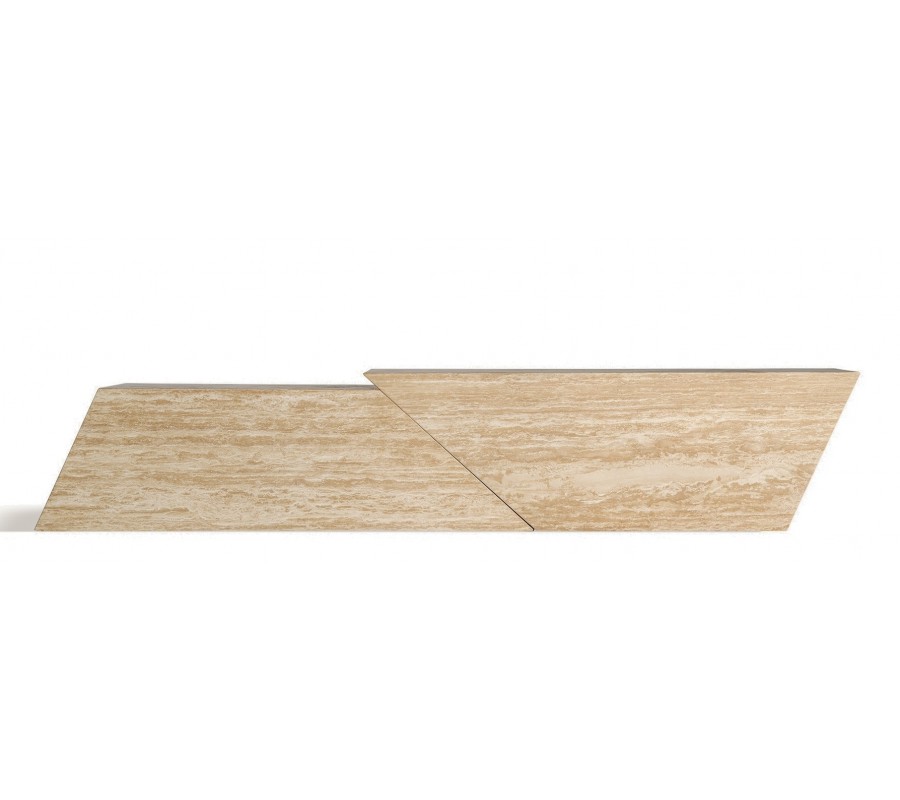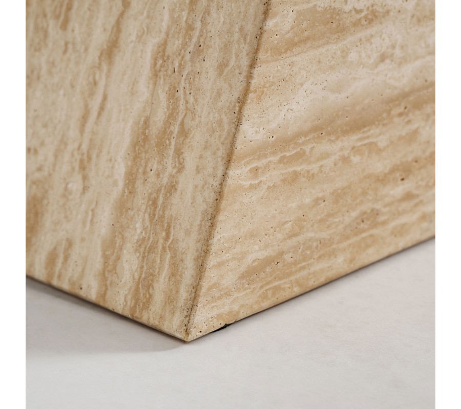 Celý tvar pripomína kosoštvorcovú siluetu, kde precízne skosené hrany a diagonálne línie umocňujú jeho sochársky výraz. Tento TV stolík nepôsobí len ako funkčný prvok, ale aj ako umelecký objekt, ktorý dokáže v interiéri zaujať na prvý pohľad. Hladký povrch travertínu odráža prirodzené svetlo a vytvára elegantný kontrast medzi jeho matnou štruktúrou a premenlivými odtieňmi minerálnych usadenín.